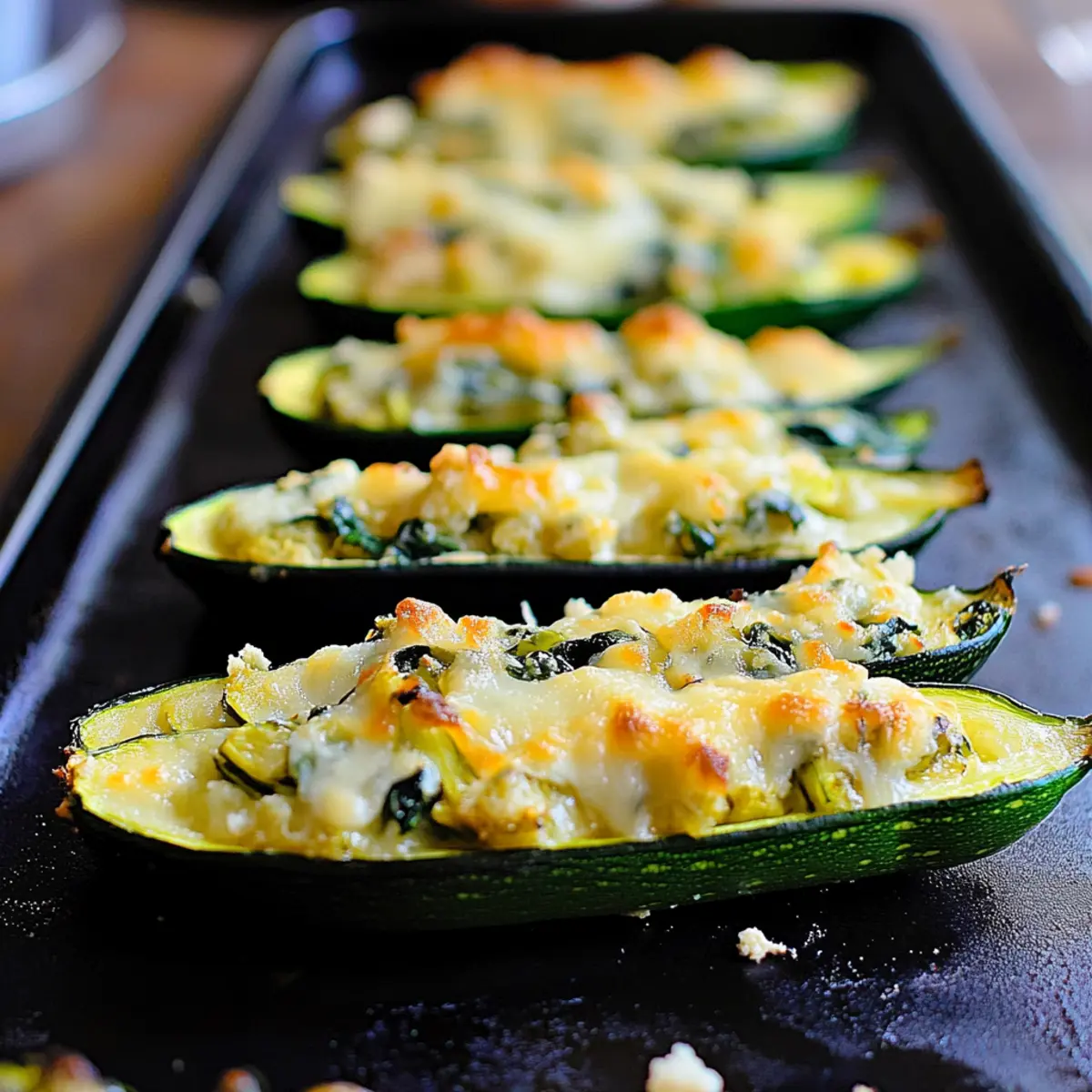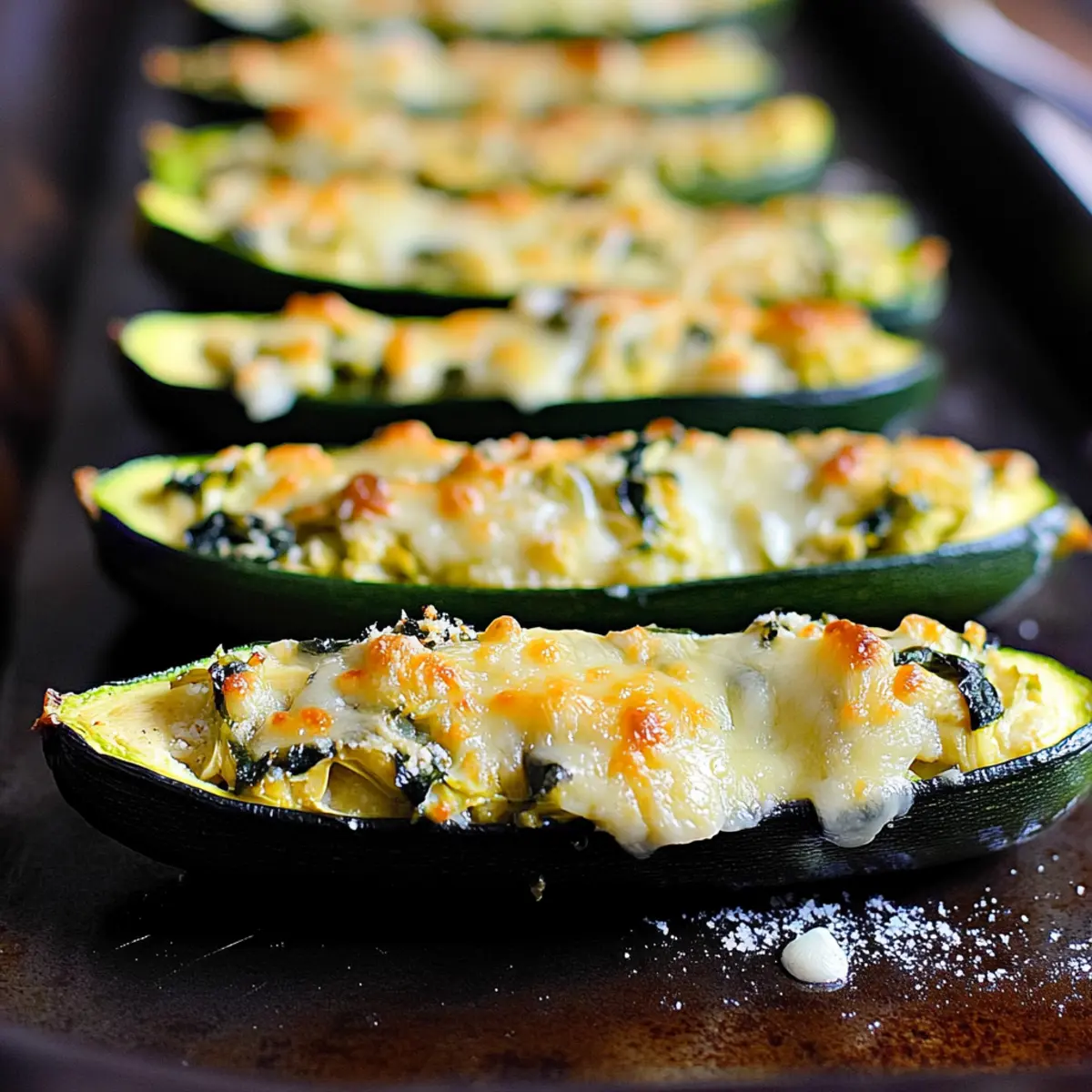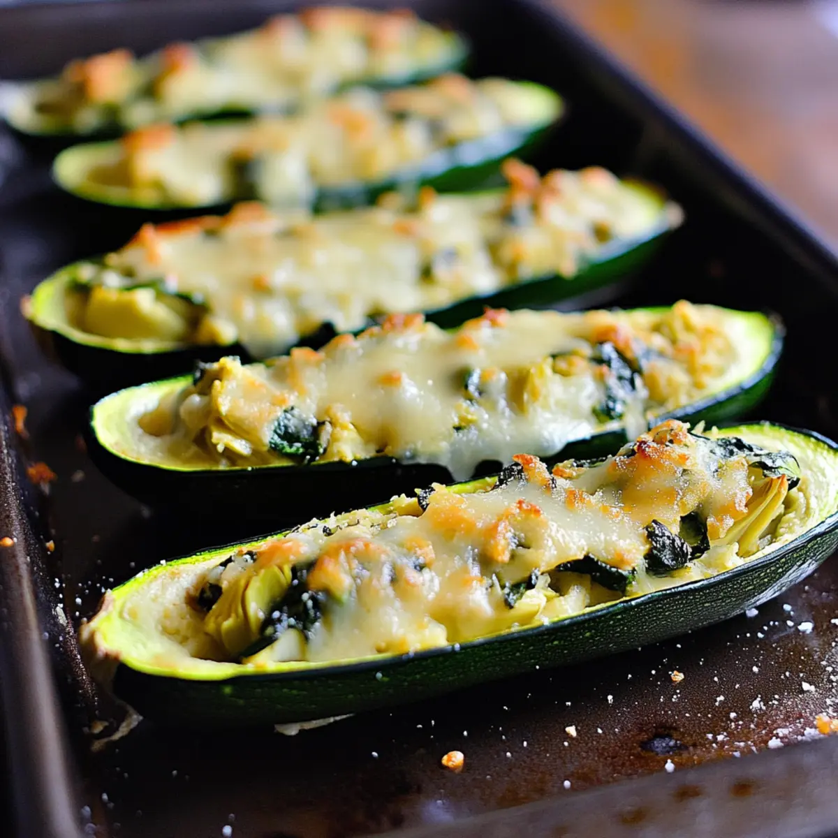 Preheat your oven to 400°F (200°C). Generously fill each zucchini boat with the artichoke and spinach mixture, ensuring they are well packed. Sprinkle any remaining Parmesan cheese on top for added flavor. Transfer the baking sheet to the oven and bake for about 15 minutes, or until the zucchini is tender to the fork. For a crispy top, switch to broil for an additional 5 minutes, keeping a close eye to prevent burning.