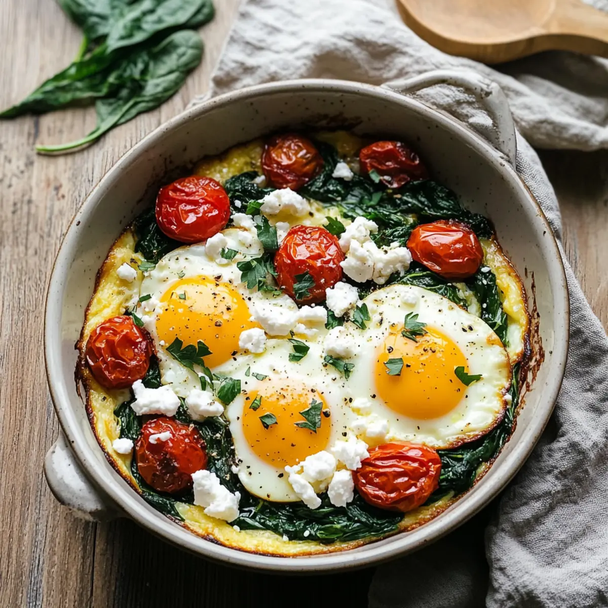 These Baked Eggs Napoleon are perfect for busy home cooks looking to save time in the kitchen! You can prep the roasted tomatoes and sautéed spinach up to 24 hours in advance. Simply store them in an airtight container in the refrigerator after cooling, which will help enhance their flavors. When you’re ready to enjoy this delightful dish, layer the prepared vegetables in your baking dish and create the wells for the eggs. Crack in the eggs and sprinkle with feta just before baking for the best results. This way, you can savor a delicious breakfast with minimal effort on busy mornings!