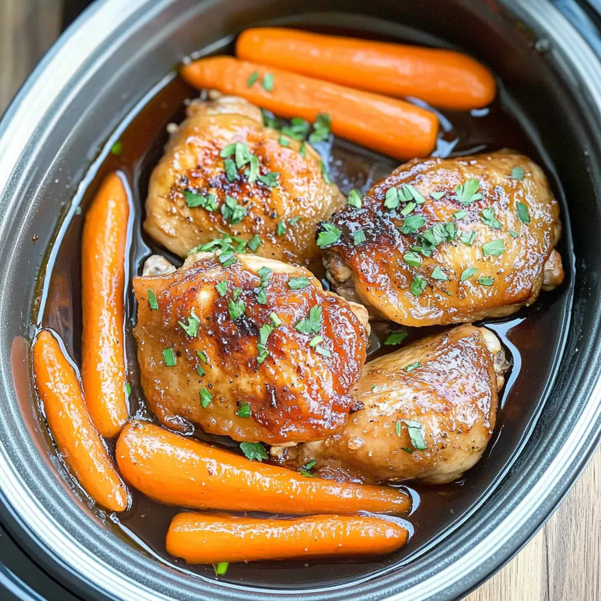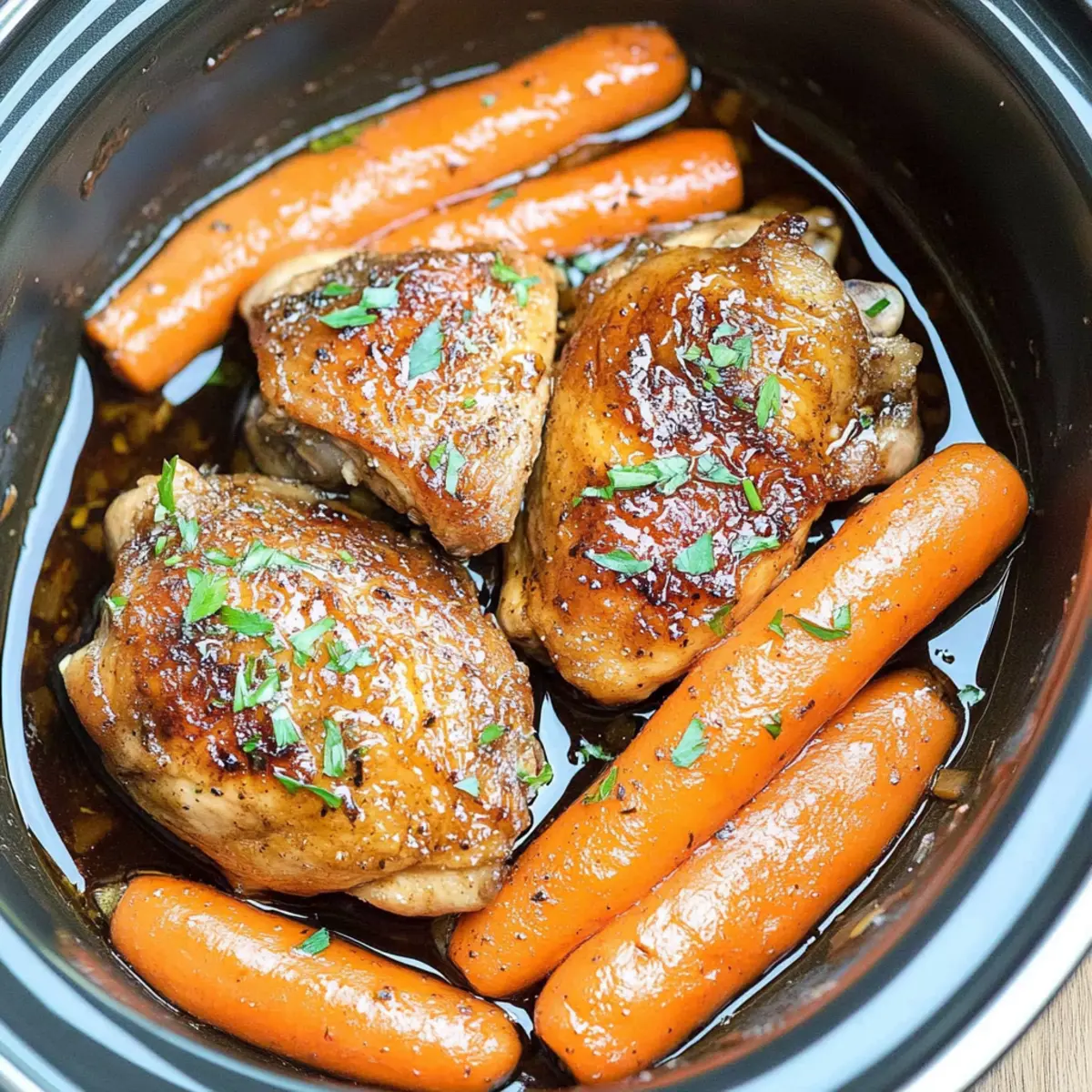 - Transfer the browned chicken thighs into your slow cooker, followed by the prepared carrots. Pour the balsamic mixture over the chicken and carrots, making sure everything is well-coated.