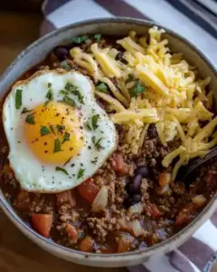 A hearty and flavorful breakfast dish combining chili and eggs, perfect for a satisfying start to your day.