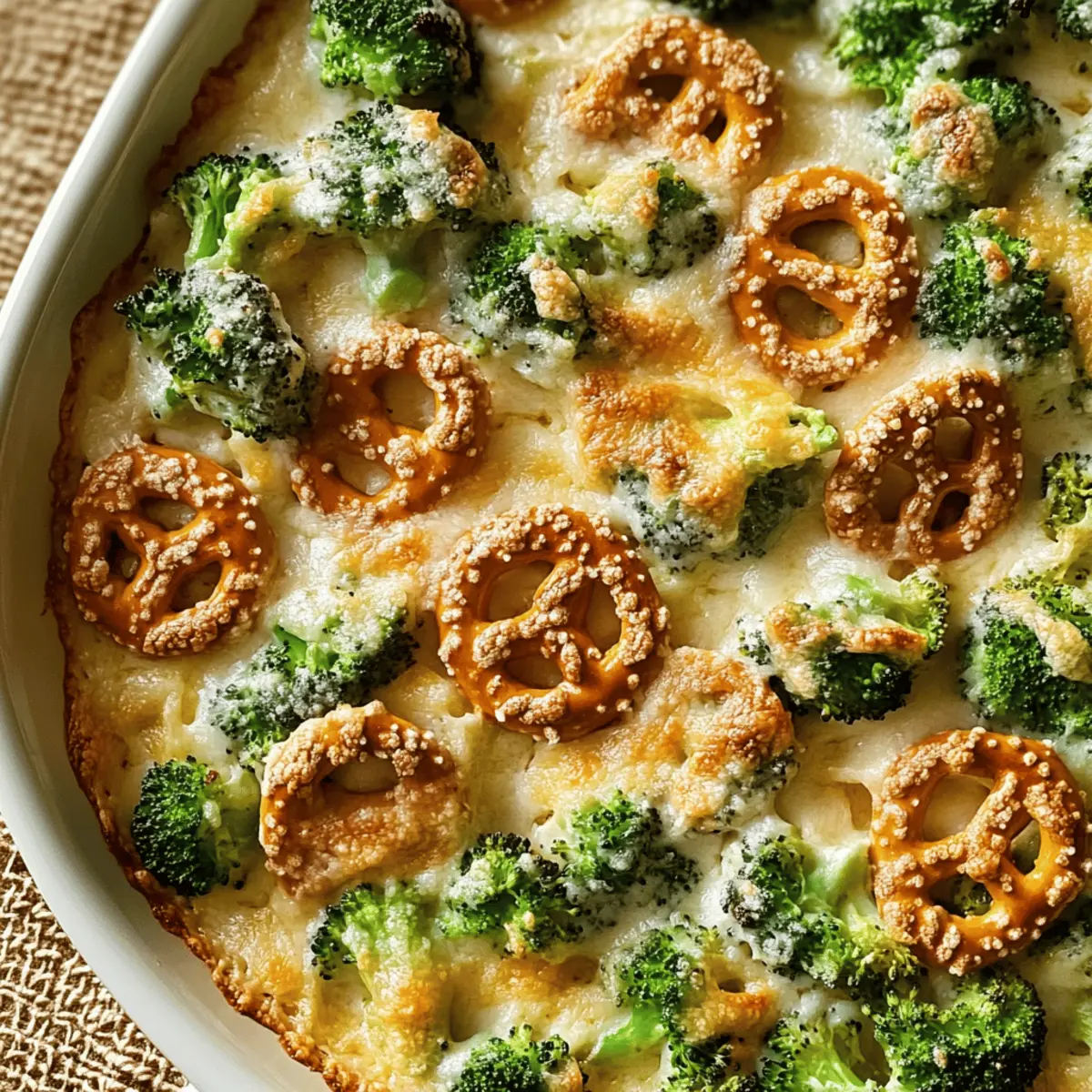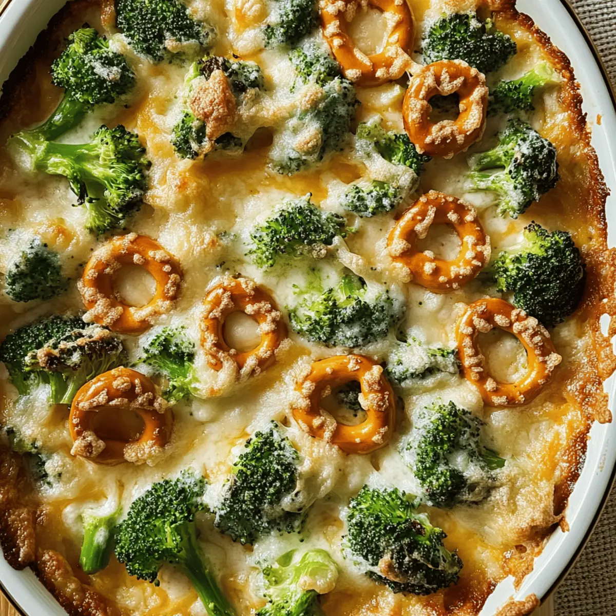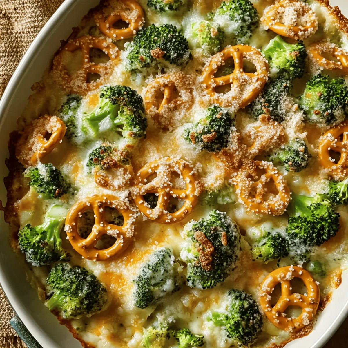 Creamy Broccoli Cheddar Casserole with Crunchy Pretzel Topping