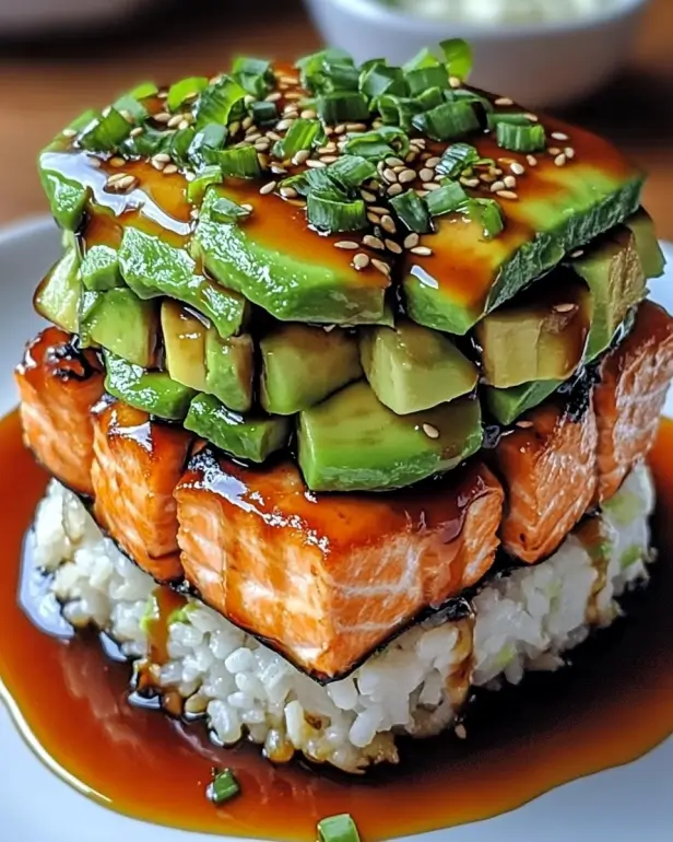 Teriyaki Salmon Avocado Rice Stack is a must-try dish!