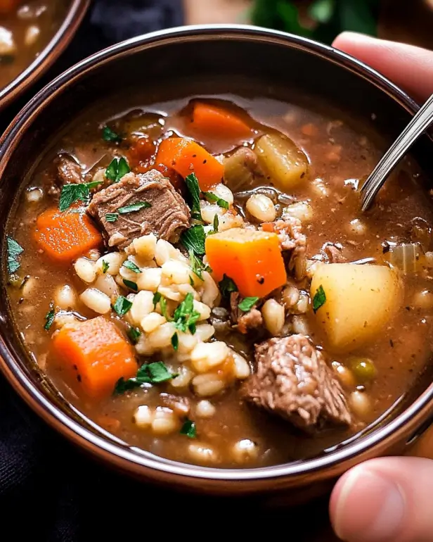 Hearty Slow Cooker Beef Barley Soup warms your soul.
