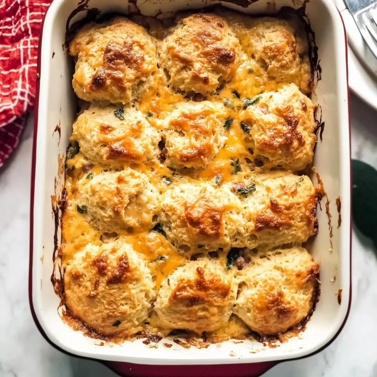 Layer Wisely: Make sure to distribute the sausage and veggies evenly in the dish. This ensures every slice of your Cheddar Bay Biscuit Breakfast Casserole shares that delicious combination of flavors.