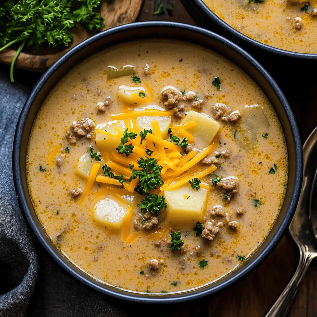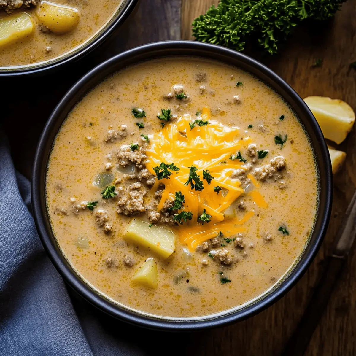 Ladle your comforting Cheesy Beef and Potato Soup into bowls and garnish with additional shredded cheese and freshly chopped parsley, if desired. The vibrant greens will add a lovely contrast, making every spoonful as appealing to the eyes as it is to the palate. Enjoy this delightful dish hot for a truly satisfying meal!