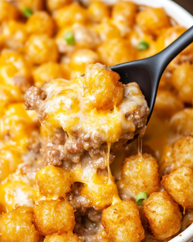 In conclusion, the Cheesy Tater Tot Casserole is a delightful dish that combines comfort and flavor in every bite. Its creamy filling, crispy tater tots, and melted cheese create a satisfying meal that appeals to both kids and adults alike. Whether you’re preparing it for a family dinner, a potluck, or simply a cozy night at home, this casserole is sure to impress.