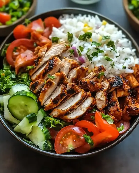 A Chicken Shawarma Bowl is a delightful dish that brings together the rich flavors of Middle Eastern cuisine. It features marinated chicken thighs, grilled to perfection, and served over a bed of wholesome brown rice. This bowl is not just about the chicken; it’s a colorful medley of fresh vegetables like cherry tomatoes, cucumbers, and red onions. Topped with a creamy tahini sauce and garnished with parsley, it’s a feast for both the eyes and the palate. Each bite offers a burst of flavor, making it a satisfying meal for lunch or dinner.