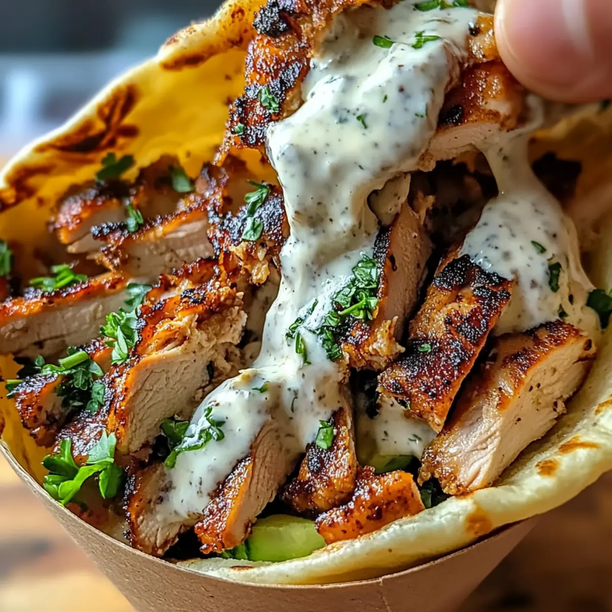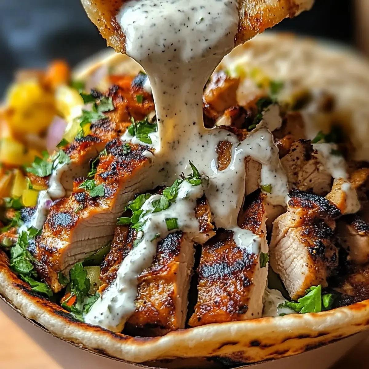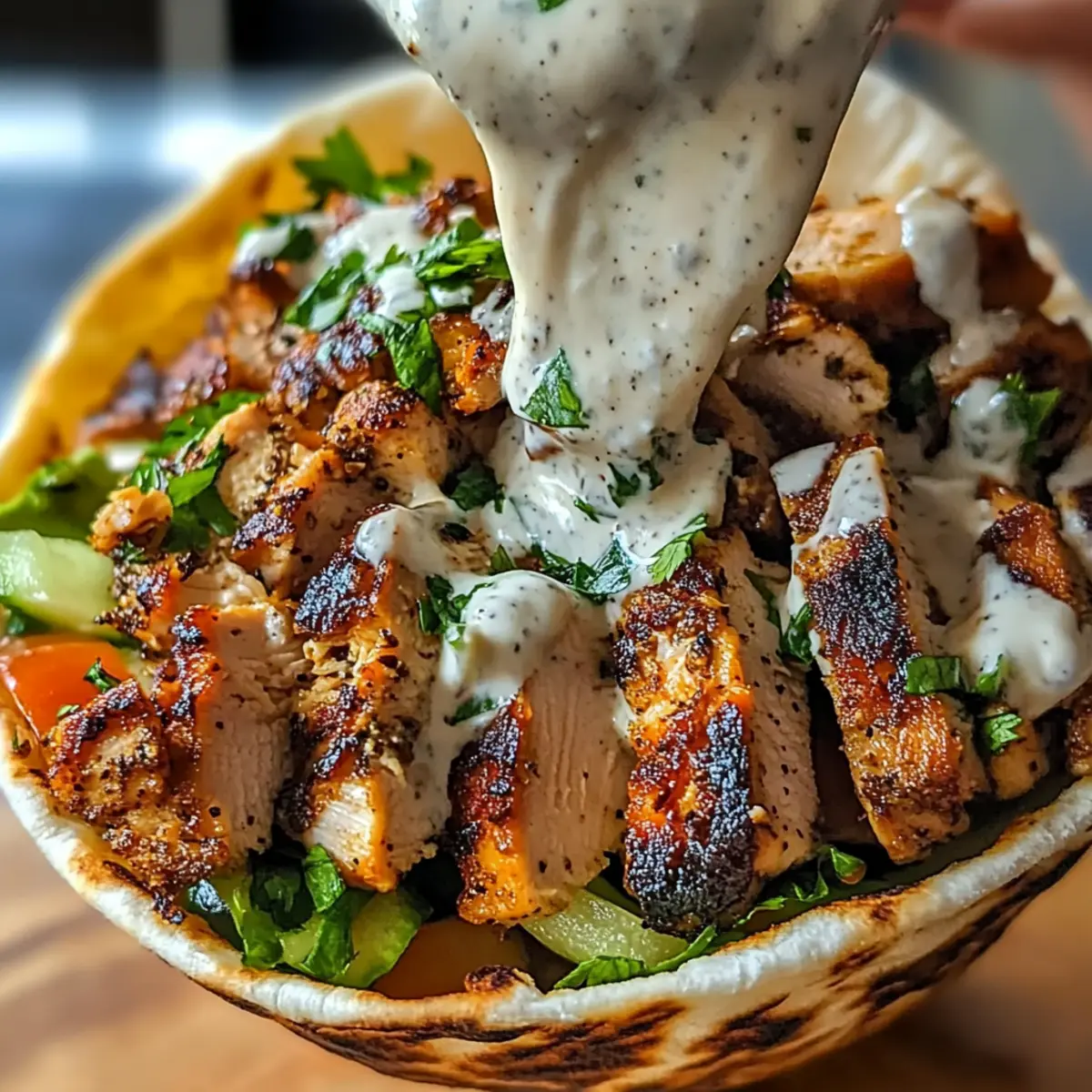 6. To serve, layer the sliced chicken in warm pita bread or arrange it on a platter. Drizzle generously with the garlic sauce and add your choice of fresh vegetables or pickled items.