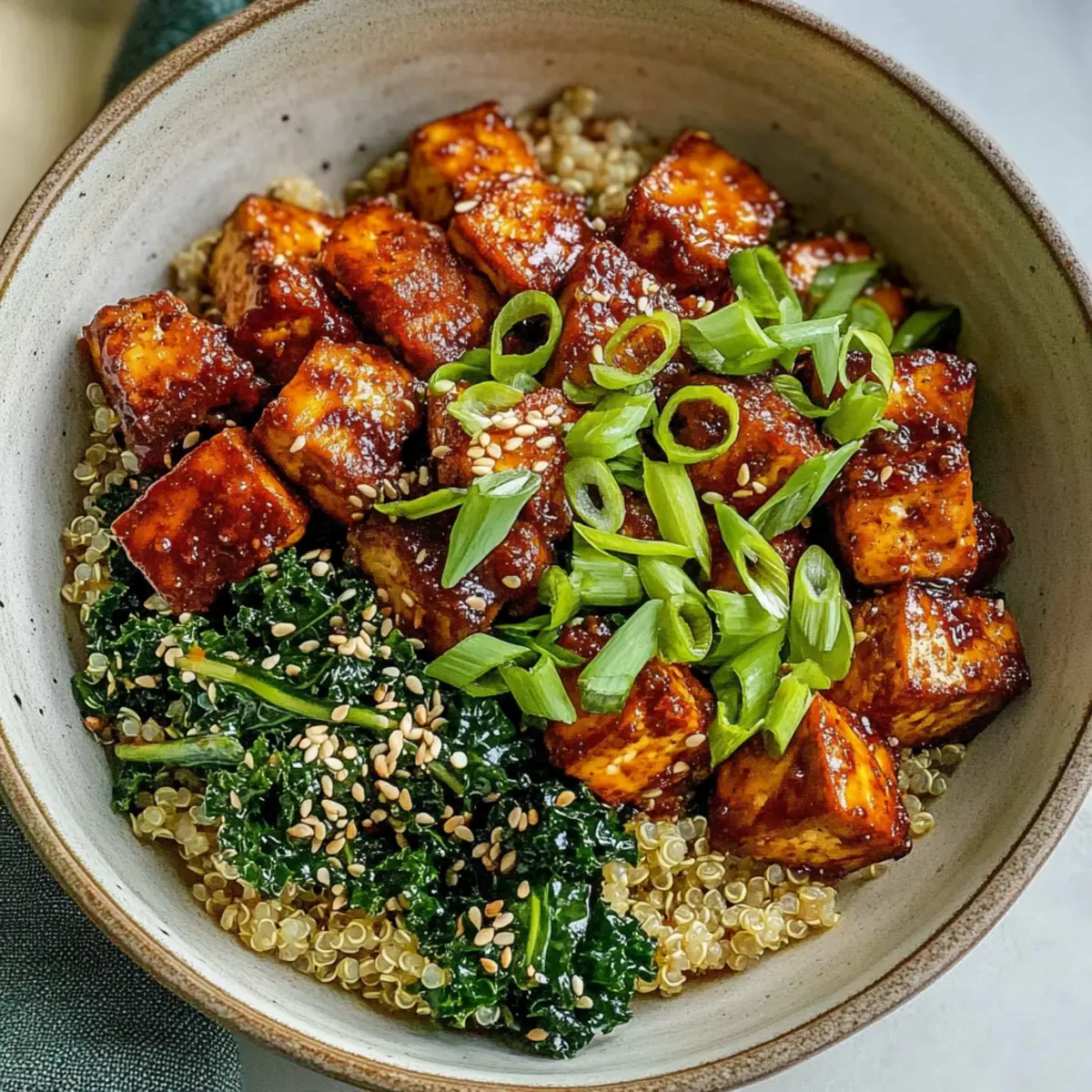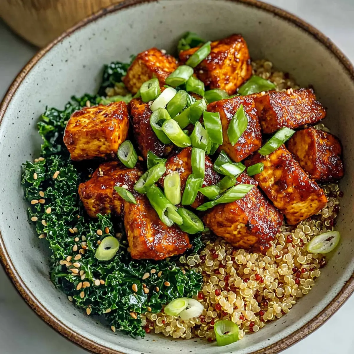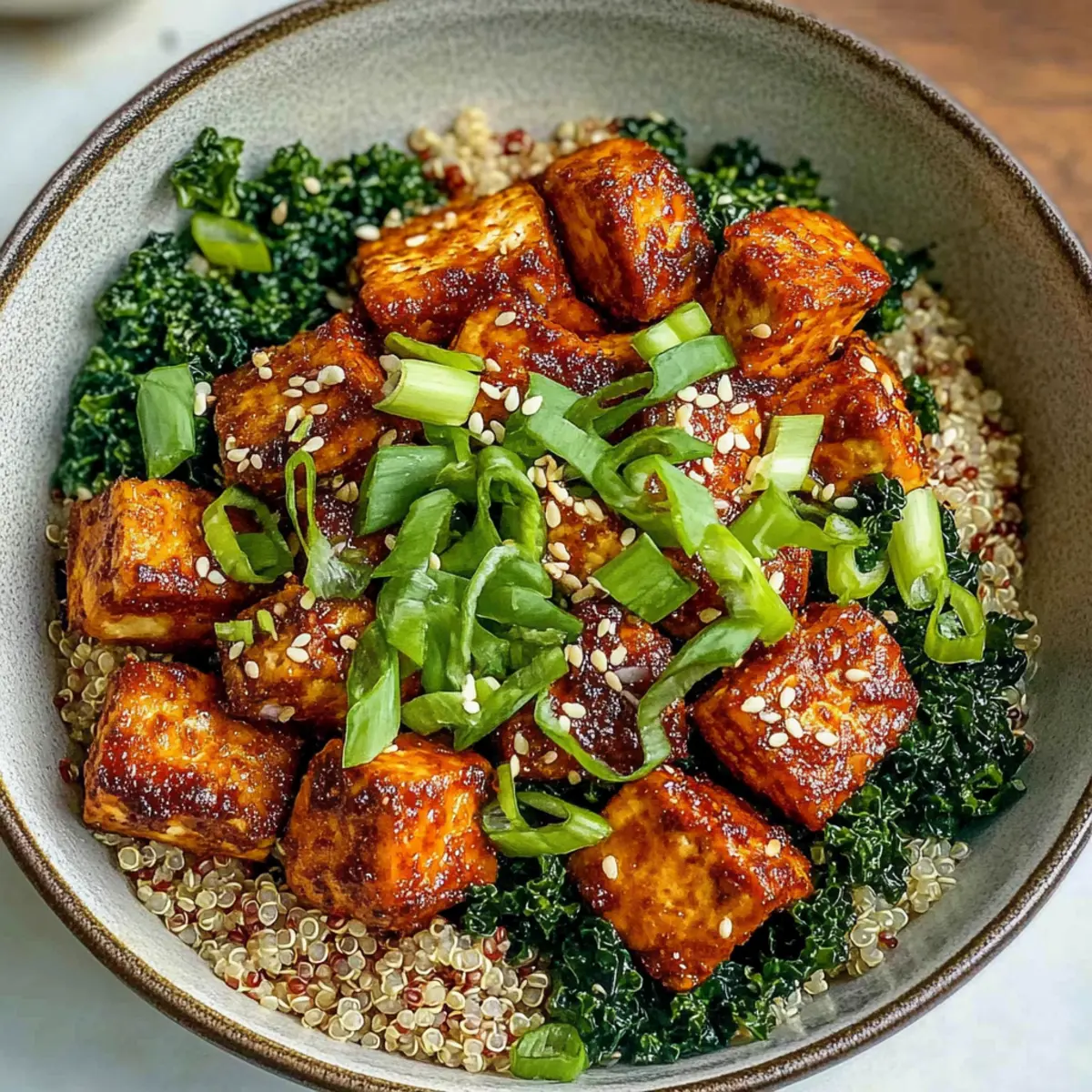 - Combine tamari, maple syrup, and chili crisp oil for sauce. Add baked tofu to quinoa and kale, pour sauce over, and toss gently to combine.