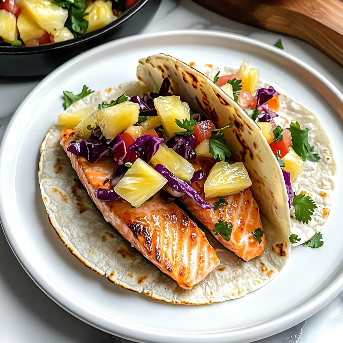 - Assemble the tacos with shredded cabbage, flaked salmon, and pineapple salsa.