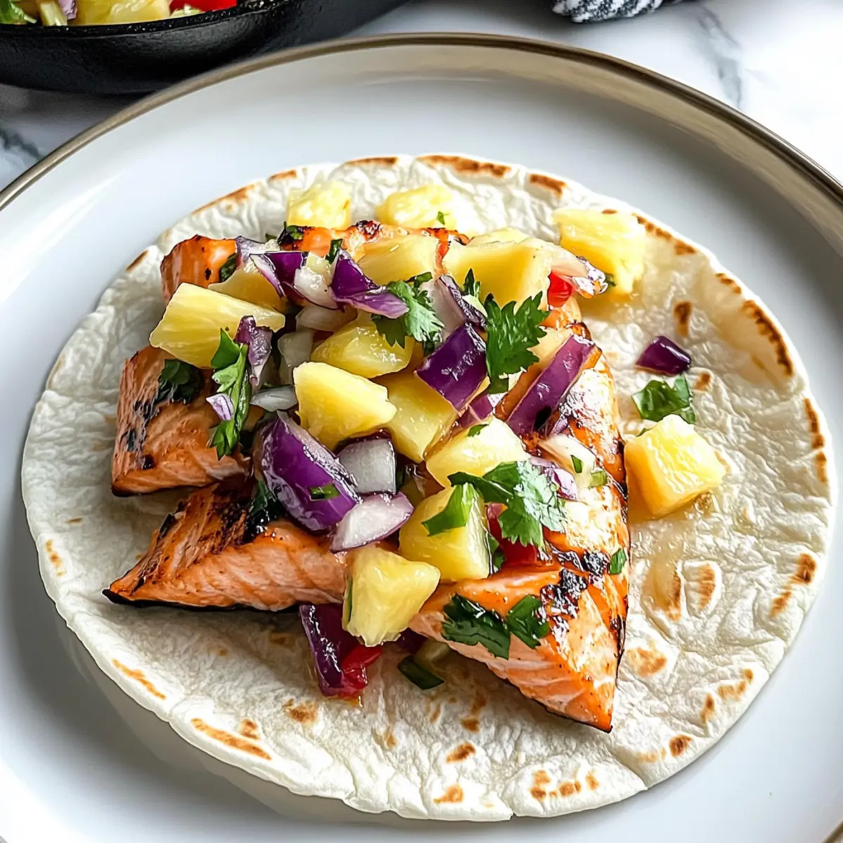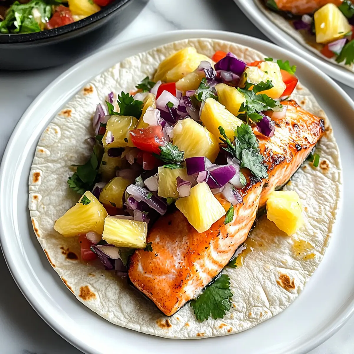 While the salmon is marinating, chop fresh pineapple, red onion, and jalapeño, then mix them in a bowl with lime juice and a pinch of salt. Stir until well combined for a refreshing pineapple salsa. Set the salsa aside to allow the flavors to meld while you finish preparing the tacos.