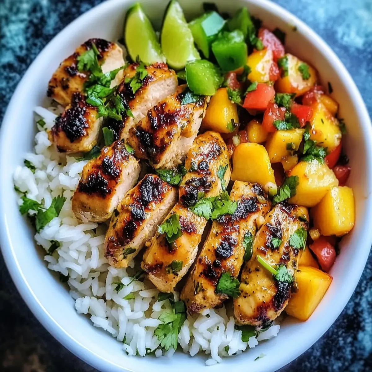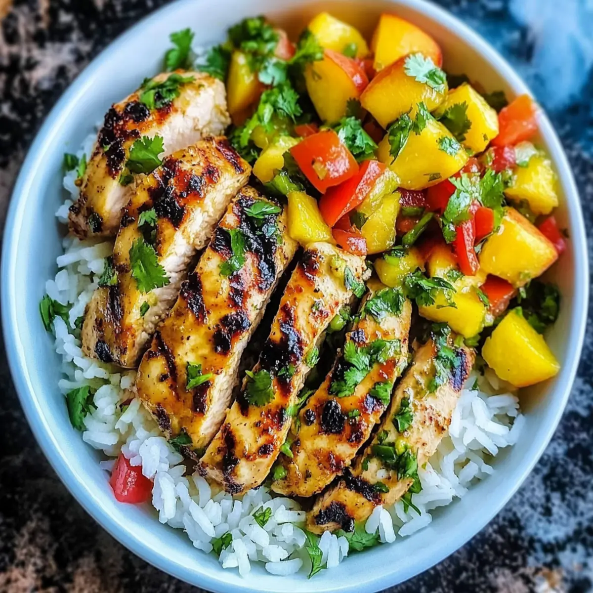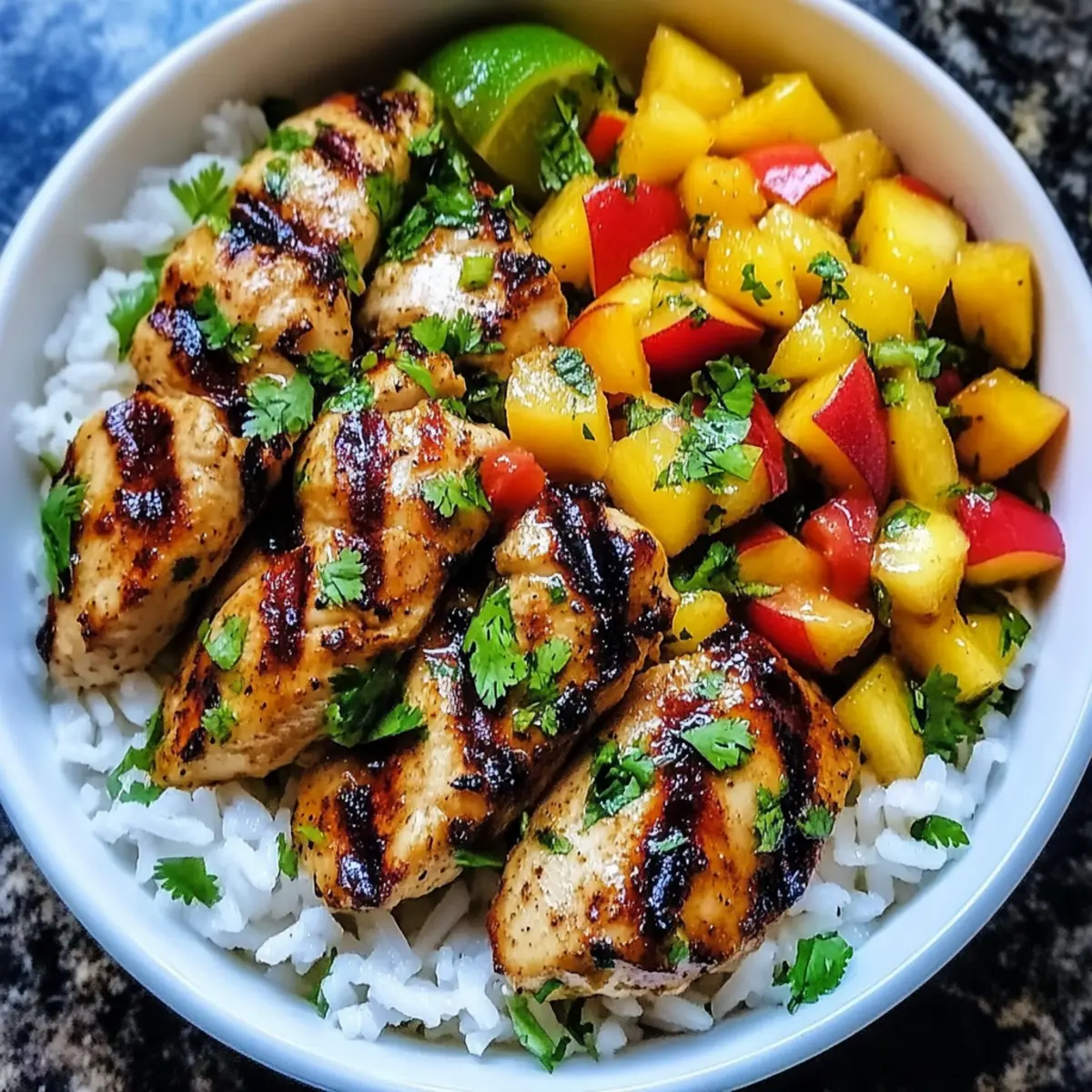 - Assemble the Bowls: In serving bowls, add jasmine rice as a base, top with chicken and peach salsa. Garnish with cilantro and lime slices.