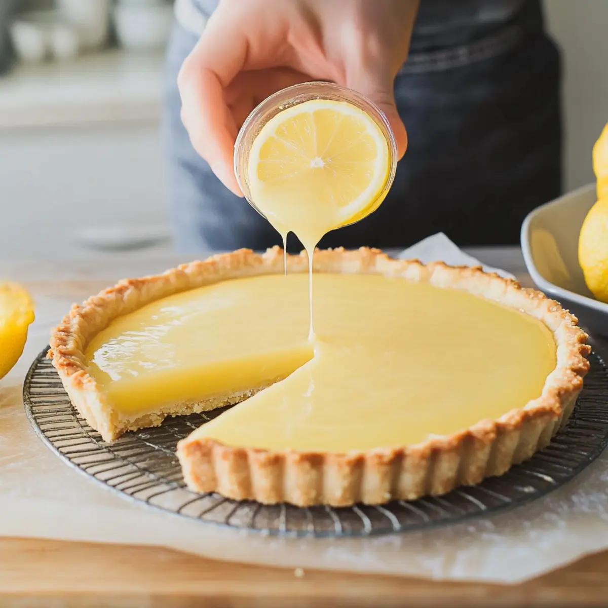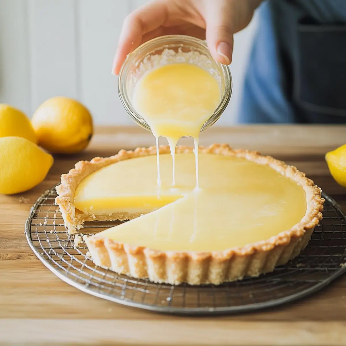 - Pour the lemon filling into the fully baked tart crust, ensuring even distribution, and smooth the top with a spatula.