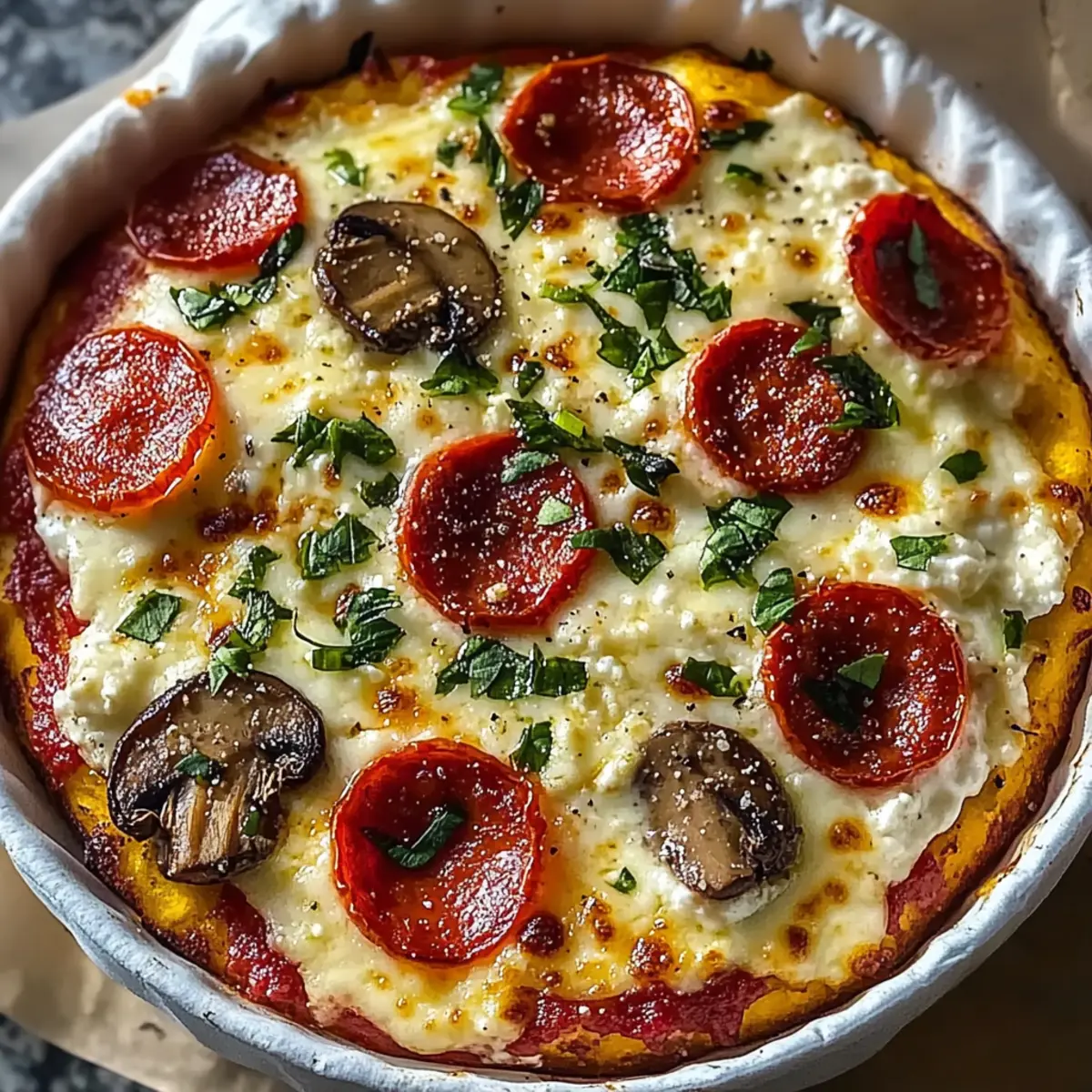 Once baked to your desired gooeyness, carefully remove your Cottage Cheese Pizza Bowl from the oven. Let it cool for a minute before serving. You can garnish it with fresh basil or other optional toppings for an extra splash of color and flavor. Enjoy every comforting bite!