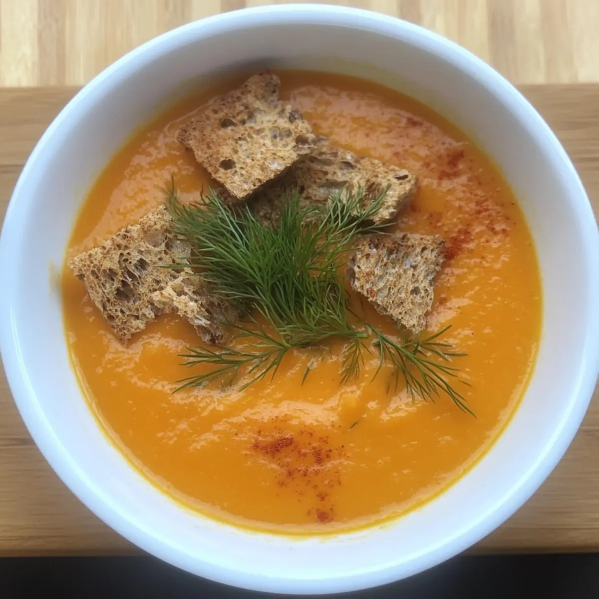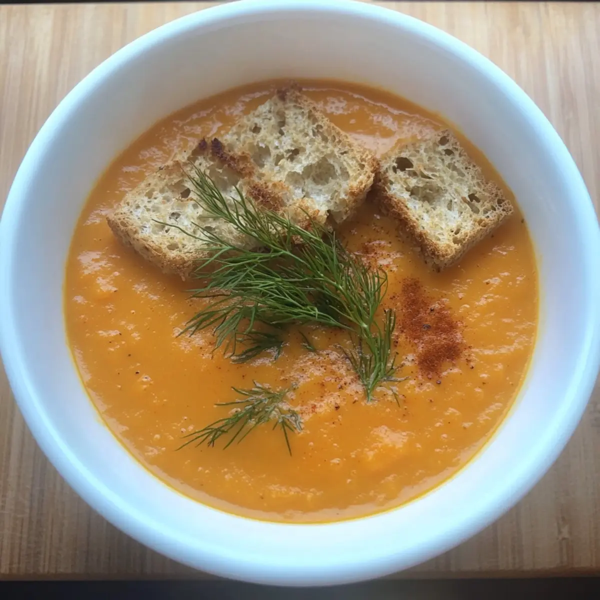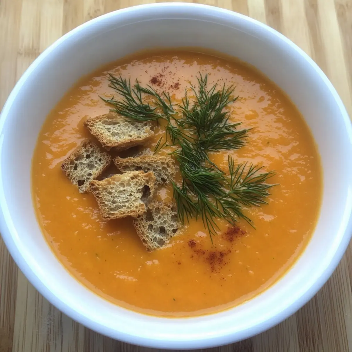 Stir in a handful of freshly chopped dill for a burst of freshness and adjust seasoning to taste, adding salt or pepper if needed. Ladle the soup into warm bowls and enjoy it hot. For added texture and flavor, consider topping your delightful Cream of Carrot Soup with toasted croutons or extra dill.