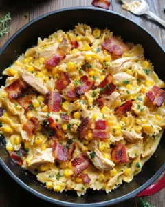 A delicious and creamy pasta dish featuring chicken, corn, and crispy bacon, perfect for a comforting meal.