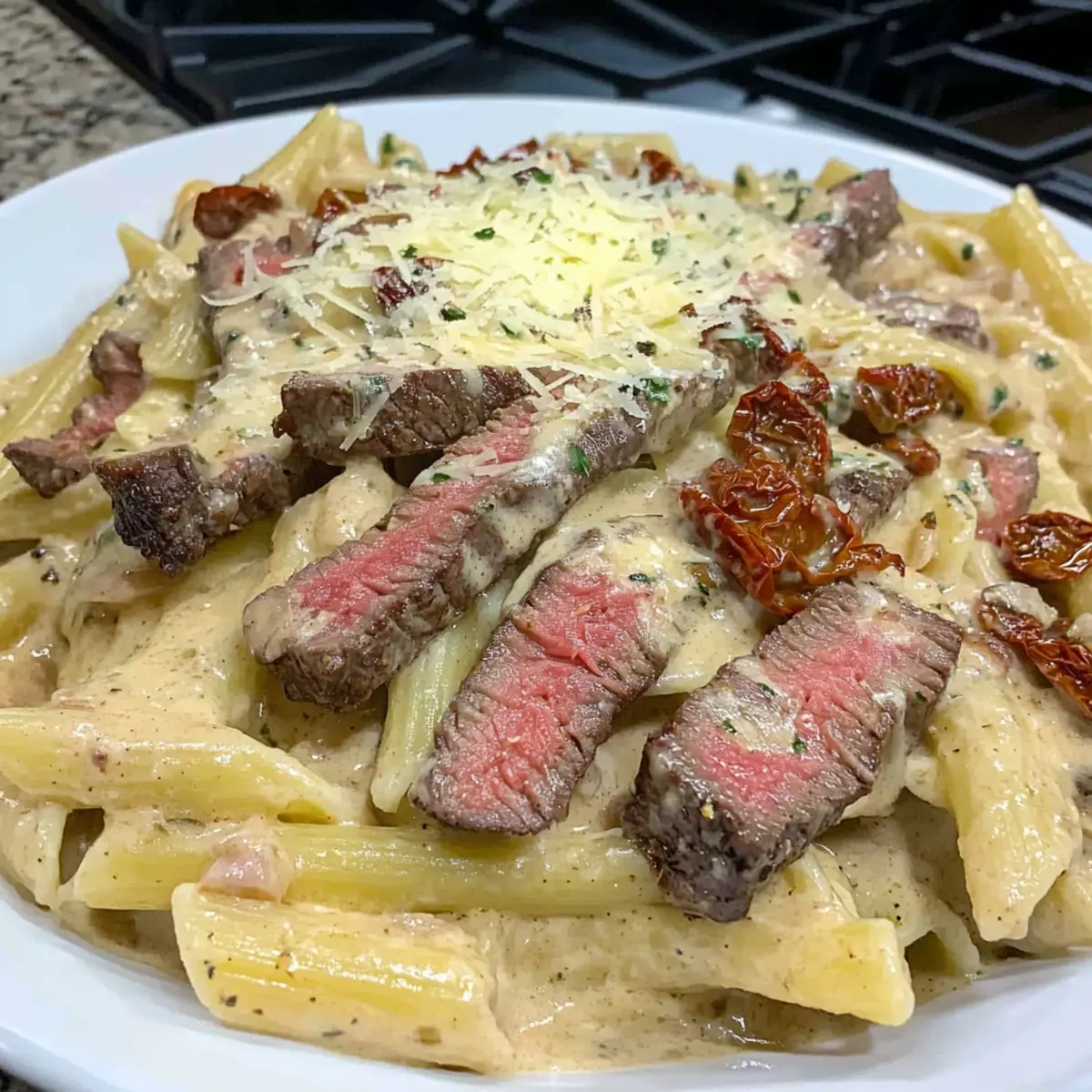 Slice the rested steaks thinly against the grain and either mix them into the pasta or lay them on top for presentation. Serve your Creamy Steak Pasta hot, complete with extra Parmesan cheese on the side, and perhaps a fresh green salad or garlic bread to enhance the dining experience.