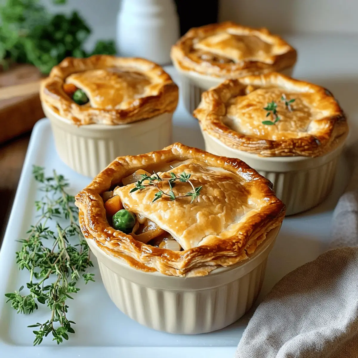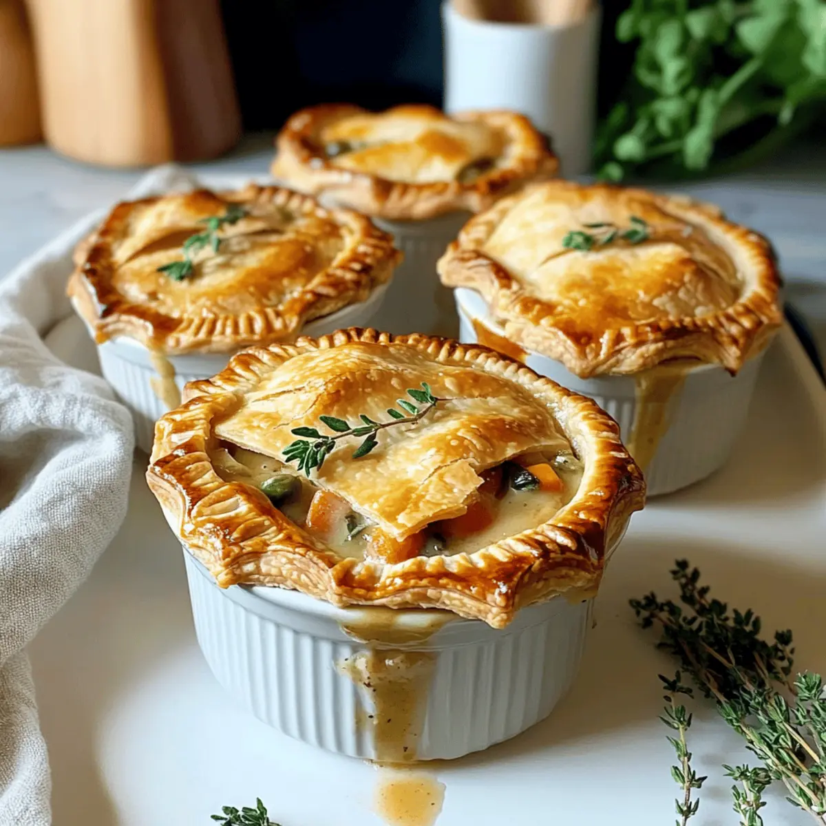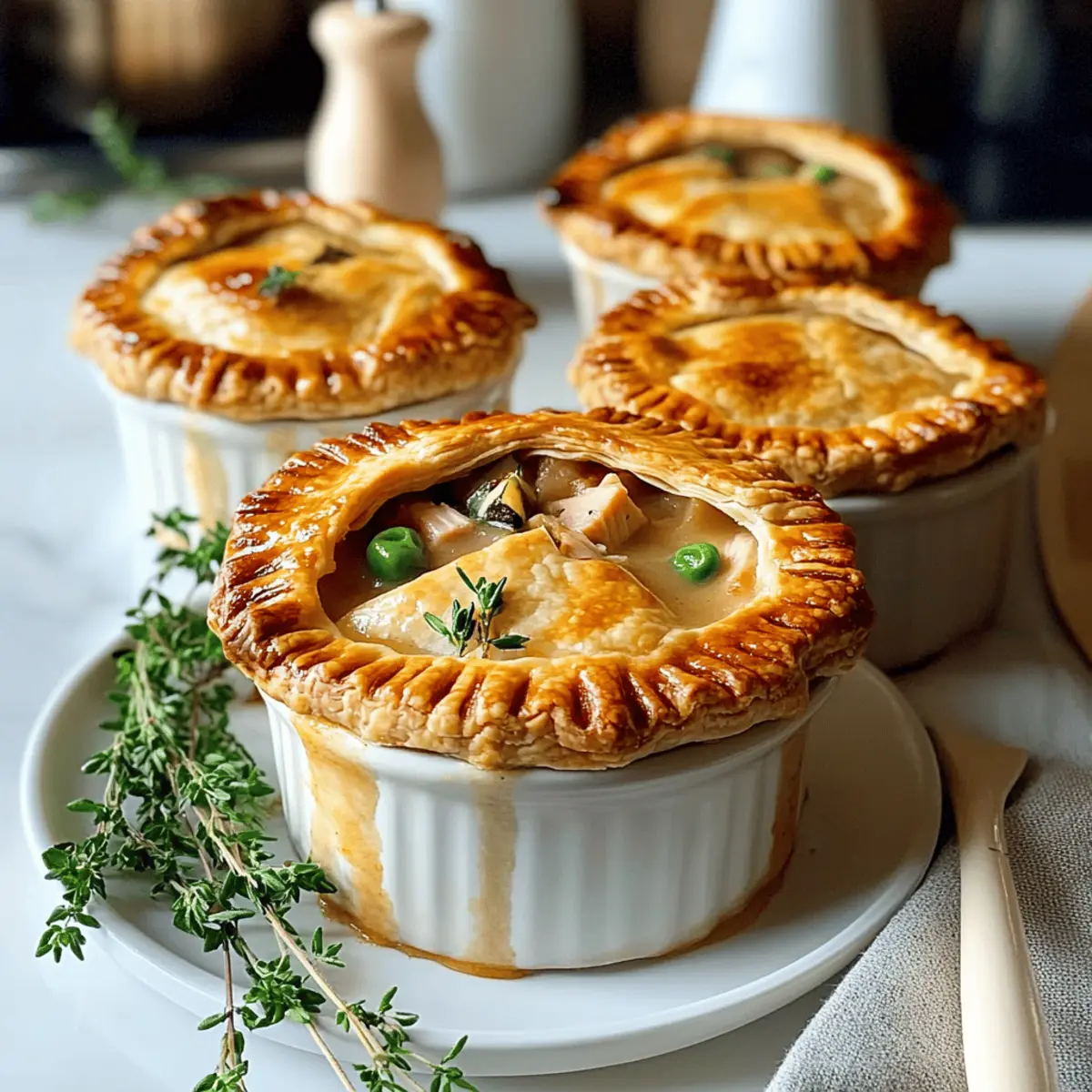 These Creamy Turkey Pot Mini Pies are perfect for busy home cooks who want to enjoy a comforting meal without the last-minute rush! You can prepare the creamy filling up to 3 days in advance; simply sauté the ingredients and store the mixture in an airtight container in the fridge to maintain its rich flavor and texture. For the crust, you can cut out the pastry circles and place them in the mini pie dishes up to 24 hours ahead—just cover them to keep them fresh. When you’re ready to bake, simply fill the crusts with the chilled filling and top them with the prepared pie crusts, then bake until golden brown and enjoy a delicious meal with minimal effort!