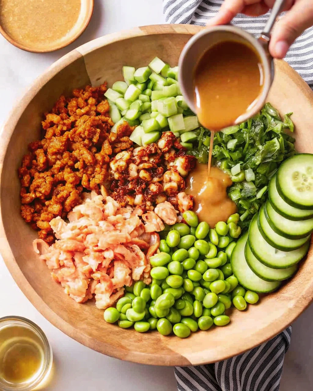 - In a large bowl, combine sliced cucumbers, edamame, green onions, avocado, crispy rice, and shredded salmon.
