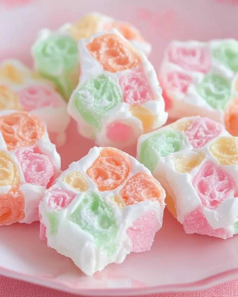 This candy is inspired by classic cathedral window cookies, which have been popular for generations. Traditionally made with chocolate and nuts, this Easter version replaces those ingredients with a light vanilla-flavored coating and pastel colors, making it perfect for spring celebrations.