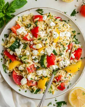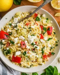 A refreshing and zesty lemon orzo salad with feta cheese, perfect for a light meal or side dish.