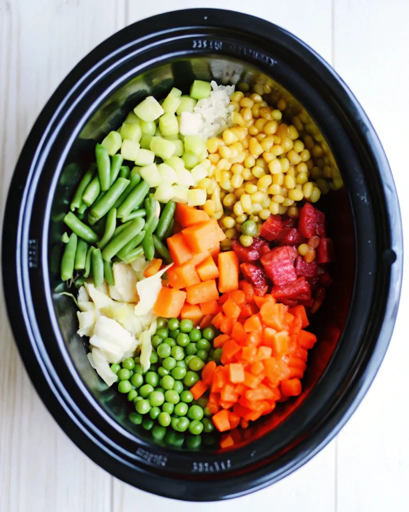 - Add Corn and Peas: In the final 5–10 minutes, uncover the slow cooker and stir in the corn and peas. Let them warm through.