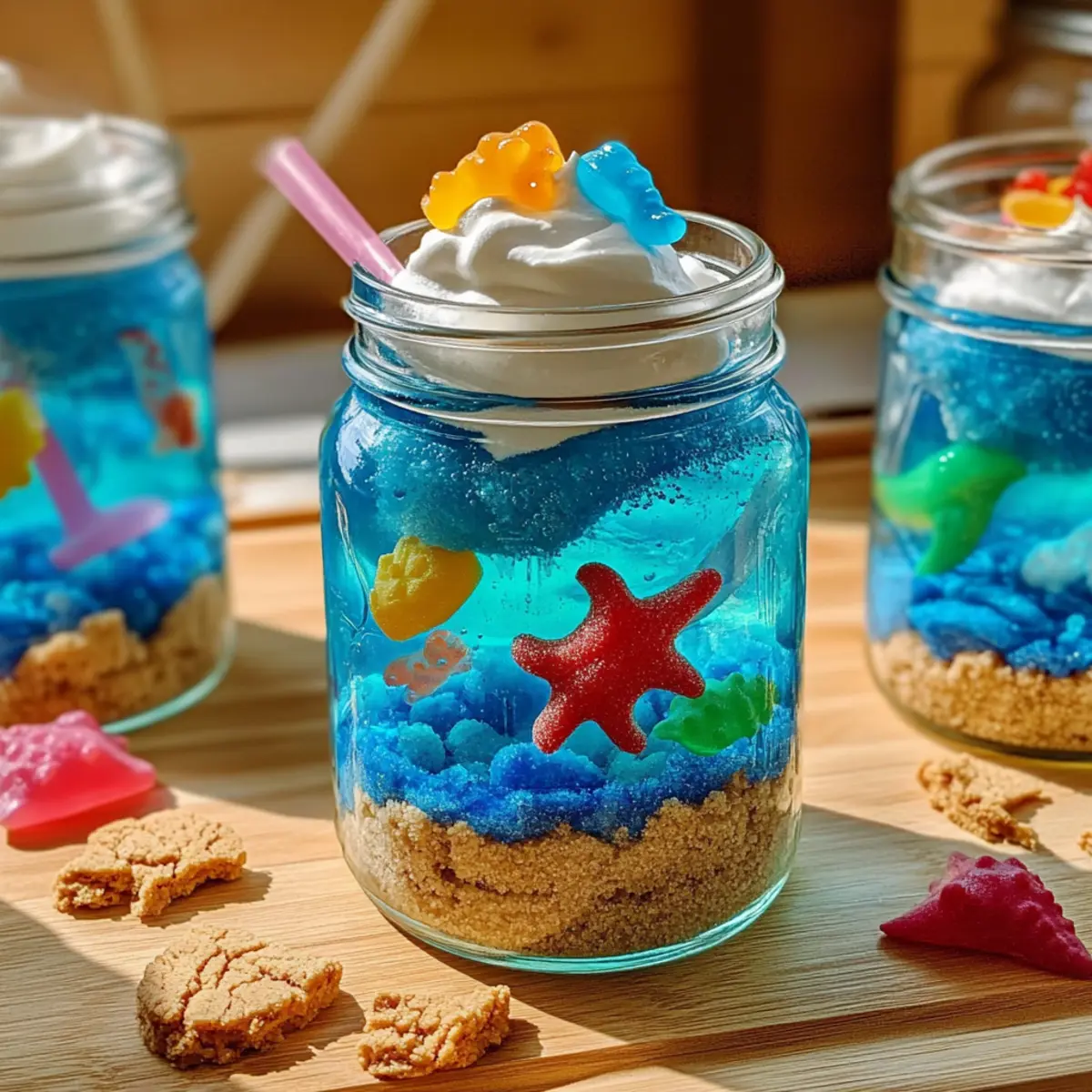 Before the gelatin sets completely, it’s time to decorate! With the gelatin still slightly soft, gently press your gummy sea creatures into the mixture. Space them out for a realistic underwater scene. Leave a few inches of space at the top of the jars for the final touches. Allow the gelatin to set completely, which may take an additional one to two hours in the refrigerator.