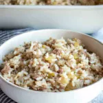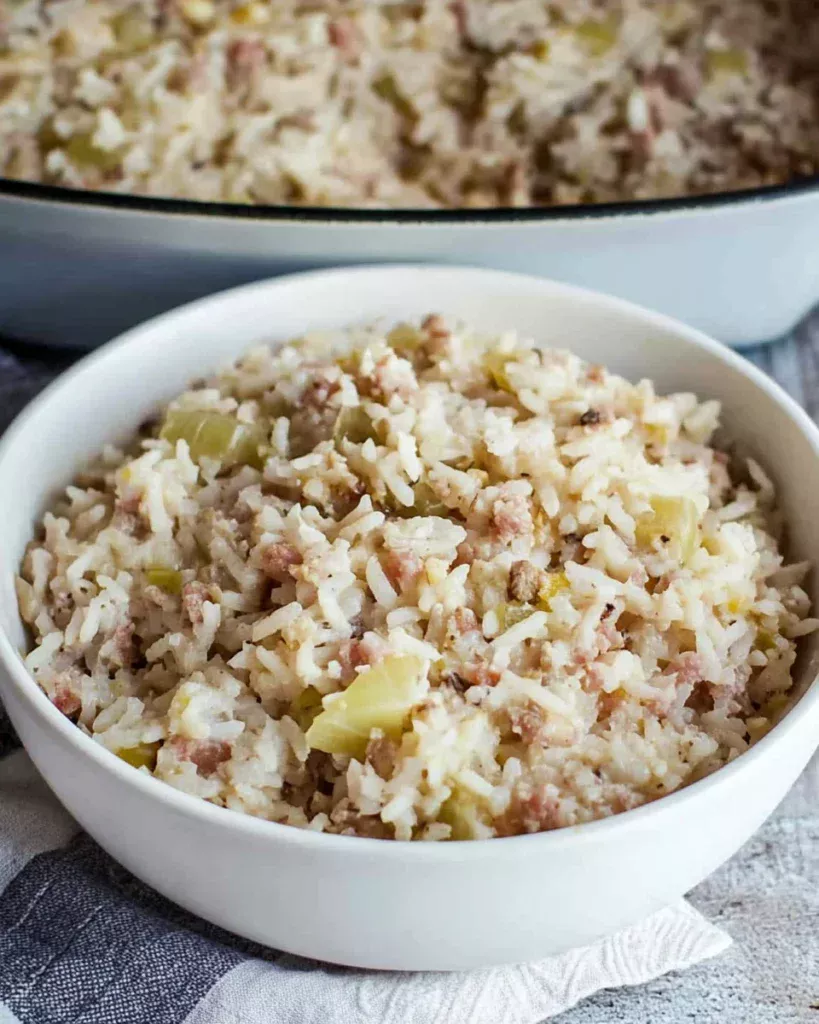 This dish combines two types of meat (ground beef and sausage) for a rich, slightly spicy, and savory base. The onions and celery add depth, while the chicken broth and cream of celery soup create a creamy, flavorful sauce that keeps the rice moist and delicious.