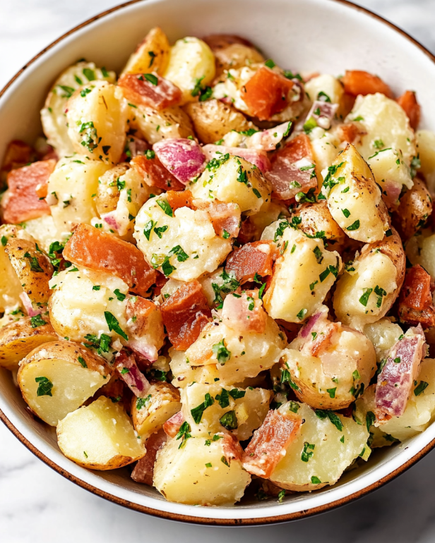 In conclusion, the German potato salad recipe is a delightful dish that brings a unique twist to traditional salads. Its combination of tender baby potatoes, crispy bacon, and a tangy dressing makes it a favorite for many. Whether served warm or at room temperature, this salad is versatile enough to complement a variety of meals, from barbecues to family dinners.