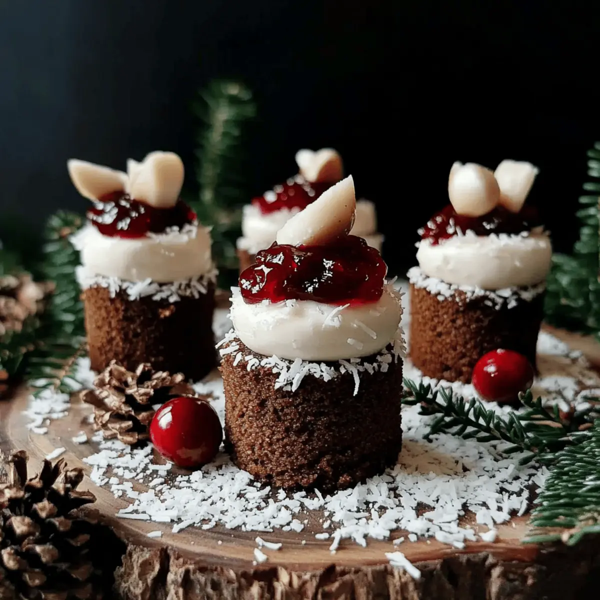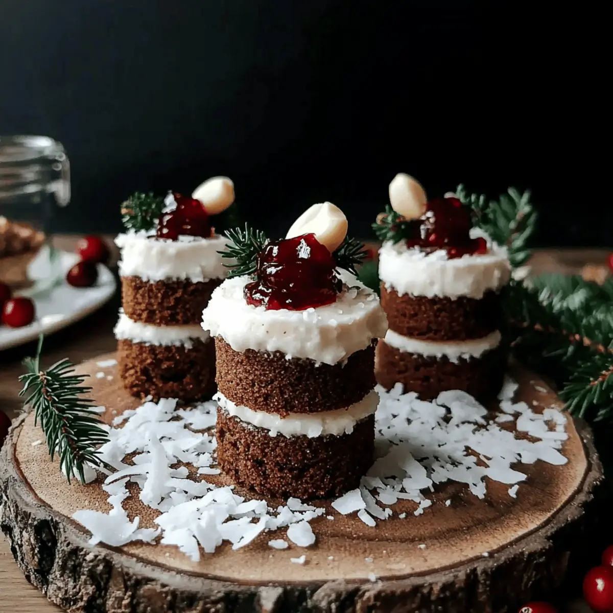 Once the mini cakes have completely cooled, it’s time for assembly. Spread a generous dollop of your creamy macadamia frosting on top of each mini cake. Don’t be shy! Finally, add a drizzle of cranberry chia jam and sprinkle coconut flakes for a snowy finish. These decorative touches will not only enhance the presentation but also elevate the flavors of your gingerbread Christmas mini cakes.