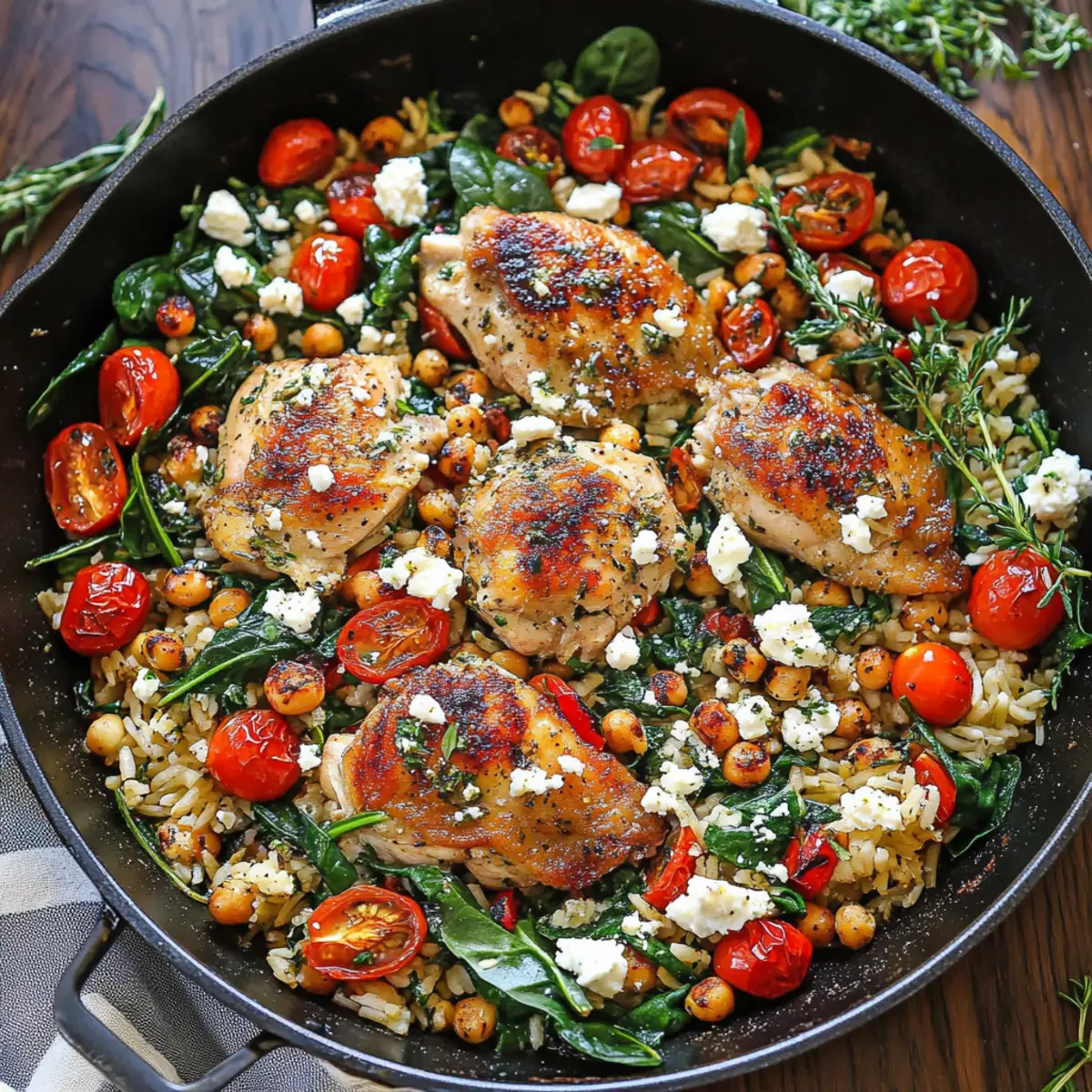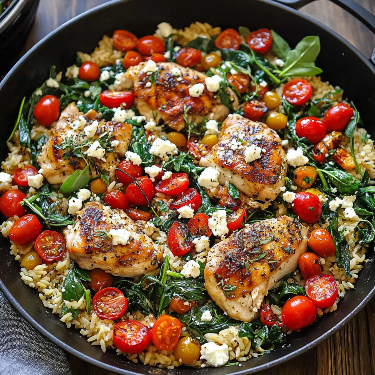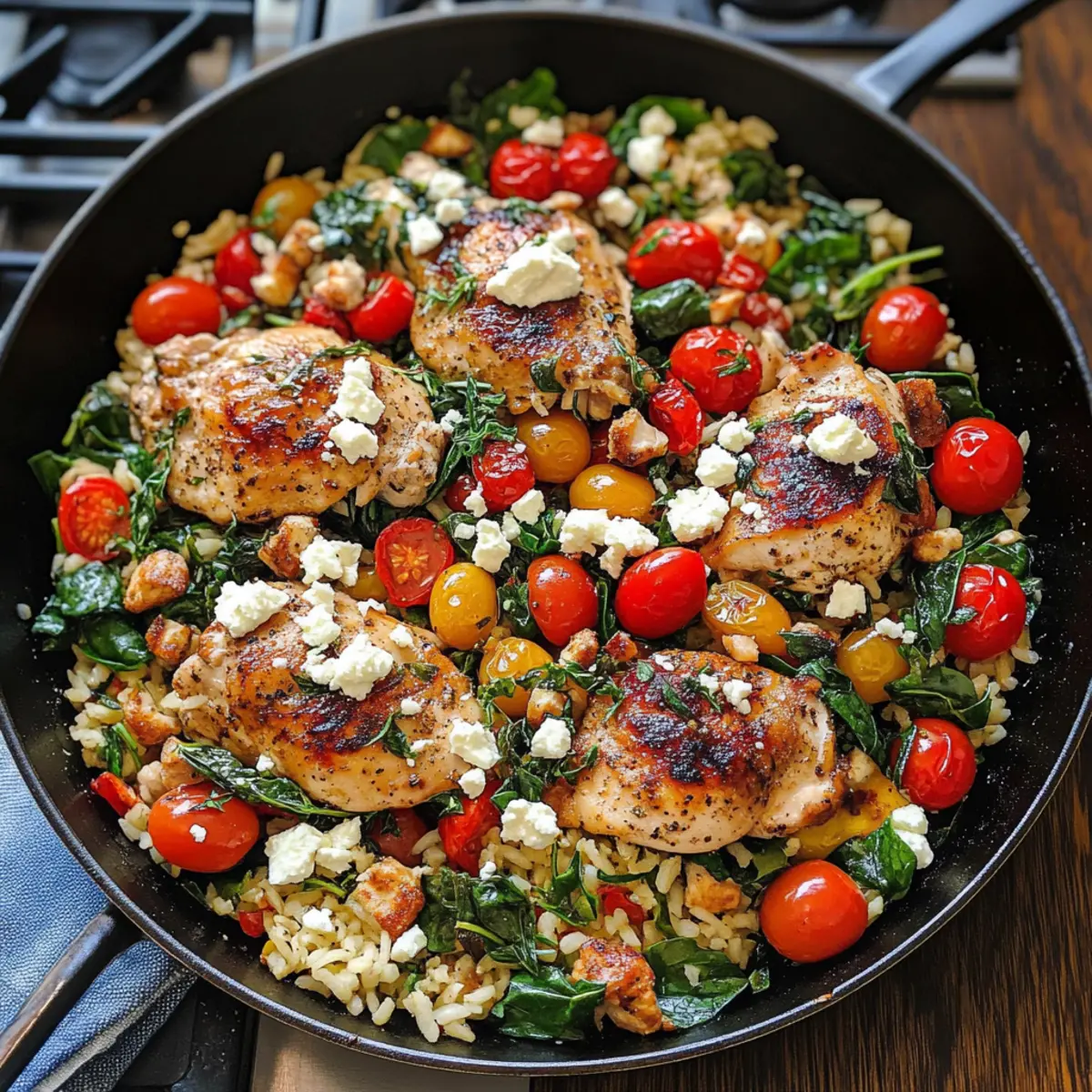 - Combine feta mixture into the skillet and top with sliced chicken.