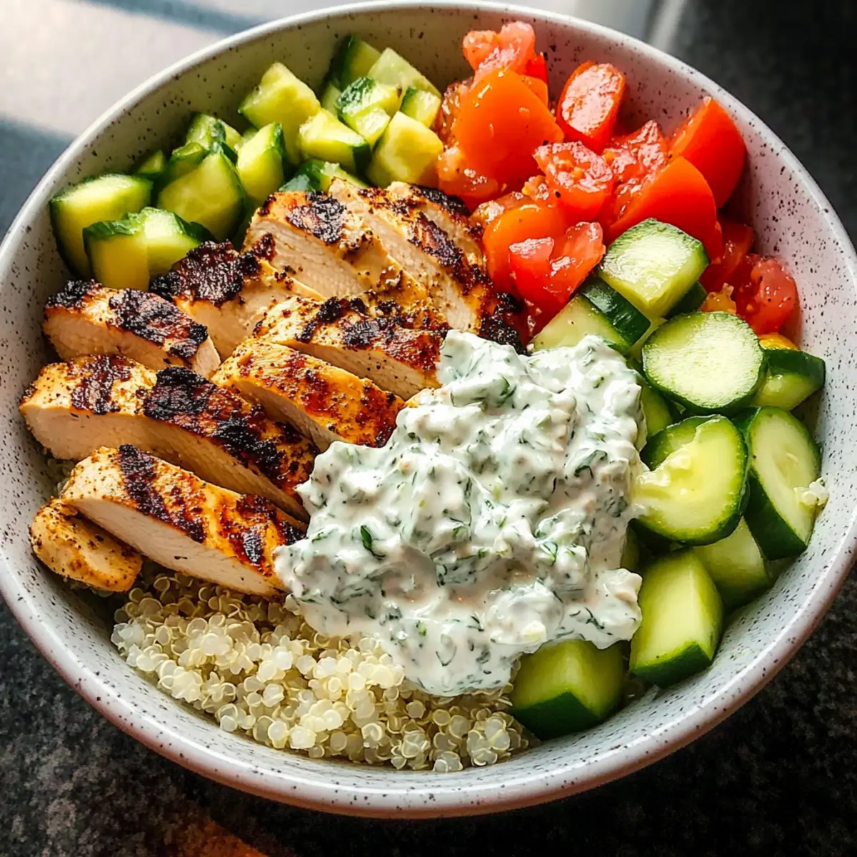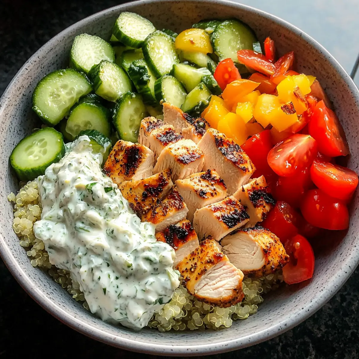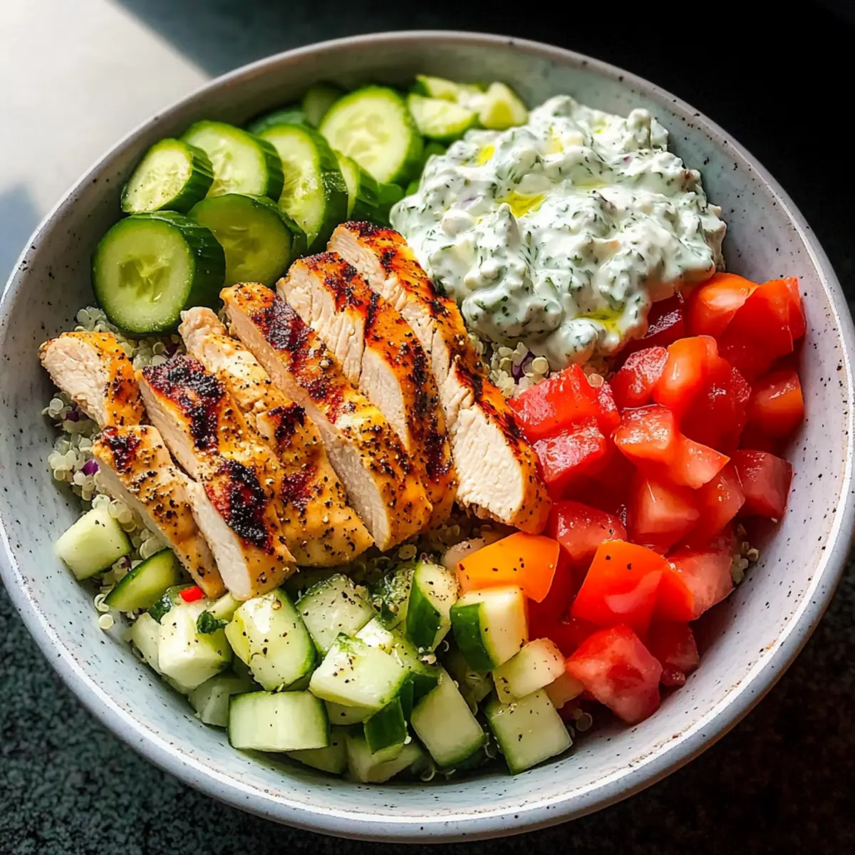 5. Assemble bowls by layering rice or quinoa, followed by fresh vegetables, sliced chicken, and drizzle with tzatziki, olive oil, and lemon juice.