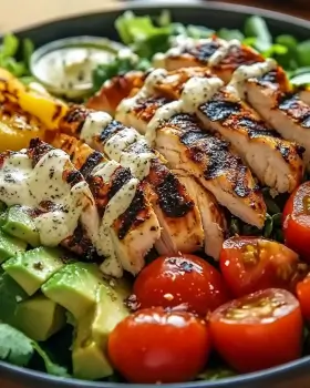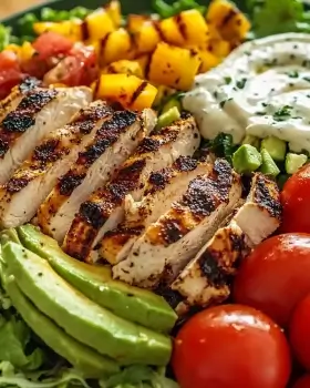 A delicious and healthy Grilled Chicken & Avocado Salad Bowl that combines fresh ingredients with grilled chicken for a satisfying meal.