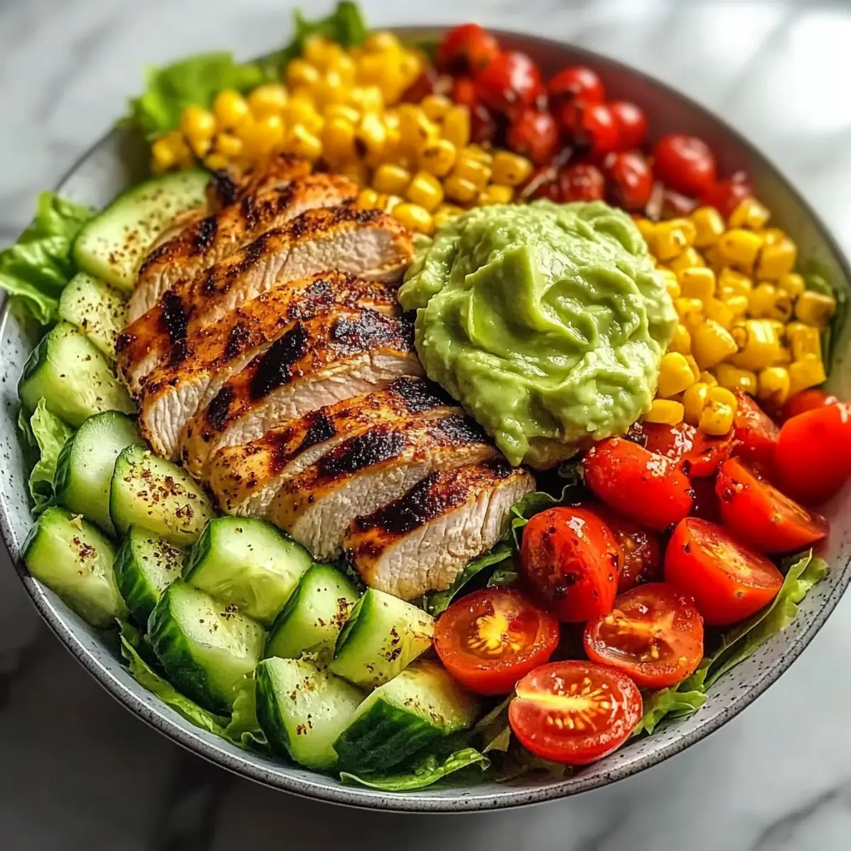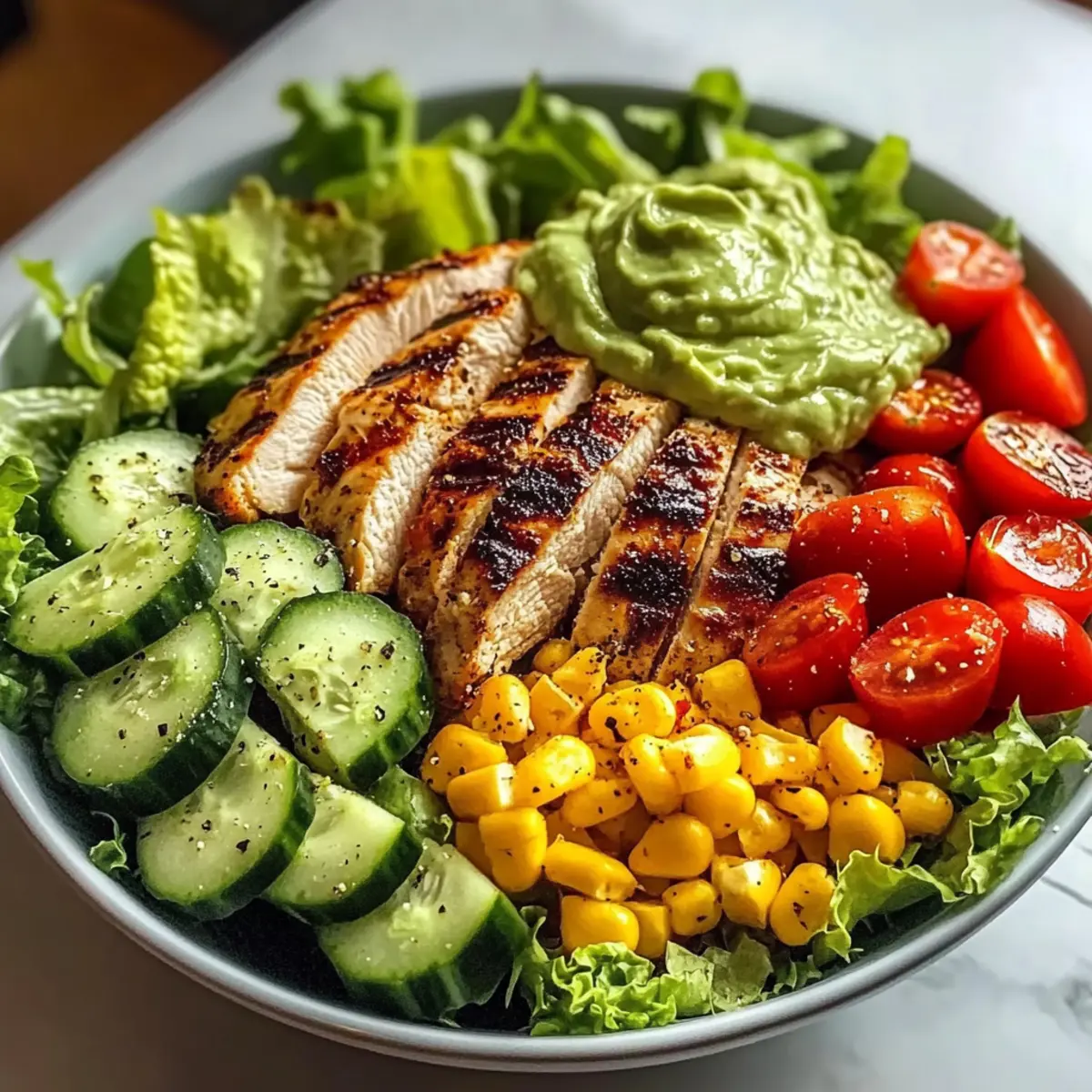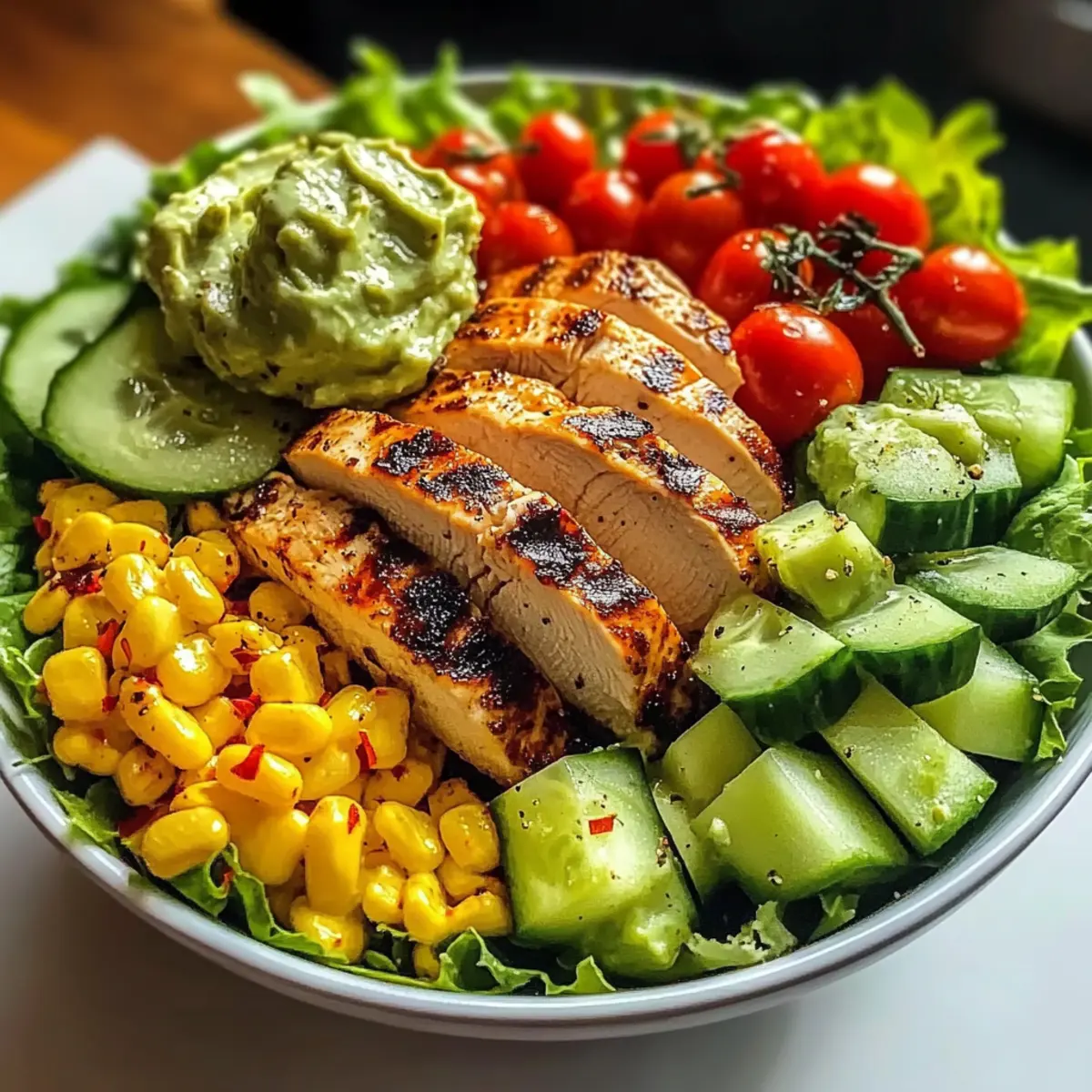 Once your grilled chicken has rested, slice it into strips and arrange them on top of the prepared salad base. In the center of the bowl, add a generous dollop of guacamole or avocado crema for a creamy touch. To enhance the flavor, sprinkle red pepper flakes on top for a bit of heat and visual appeal, making your Grilled Chicken Avocado Salad irresistible.