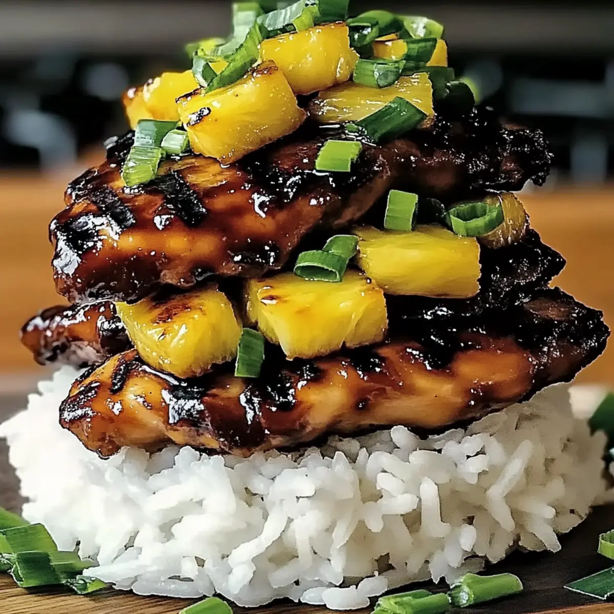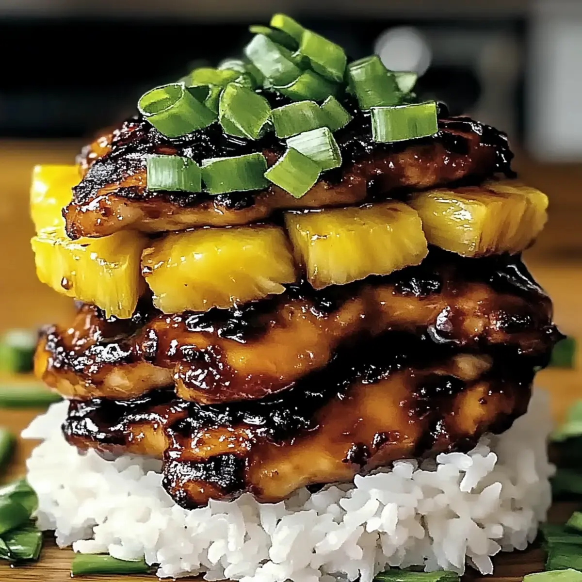 This Hawaiian Huli Huli Chicken Stack features marinated chicken thighs, pineapple juice, and sticky rice, perfect for a tropical family dinner.