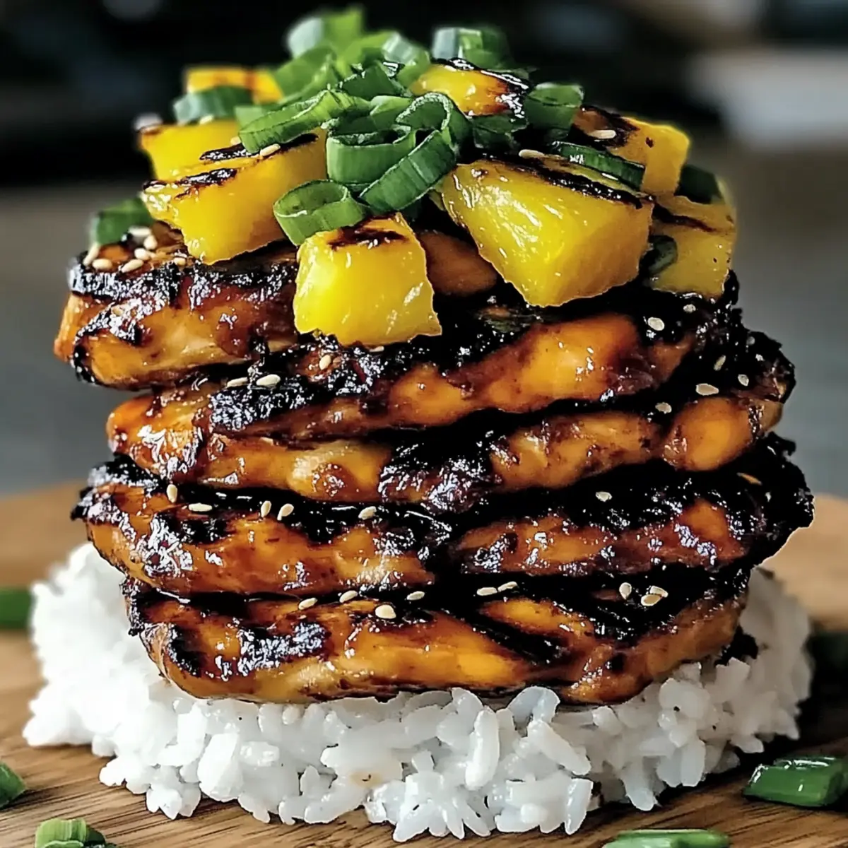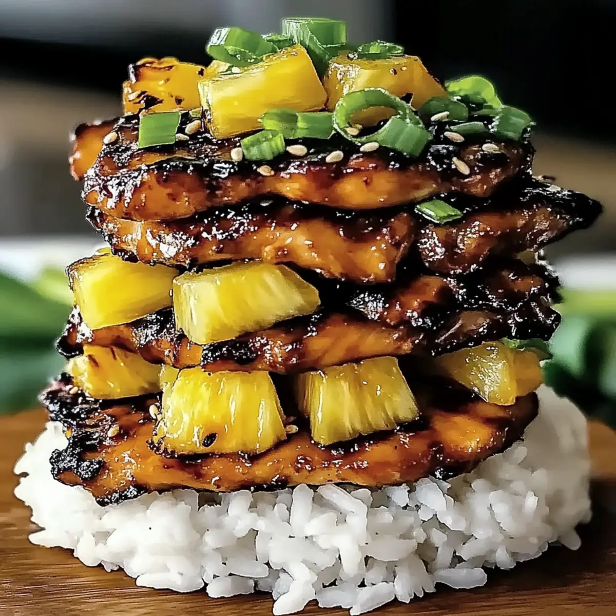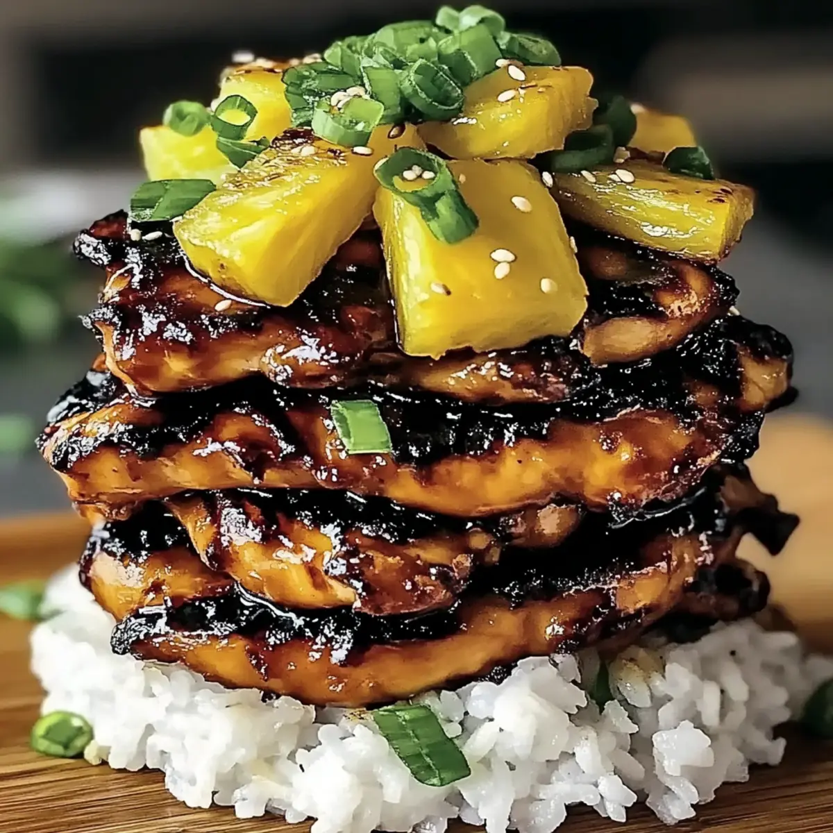 7. Build your Hawaiian Huli Huli Chicken Stack by creating a mound of warm rice, layering grilled chicken thighs on top, adding caramelized pineapple, and garnishing with green onions, sesame seeds, and fresh cilantro.