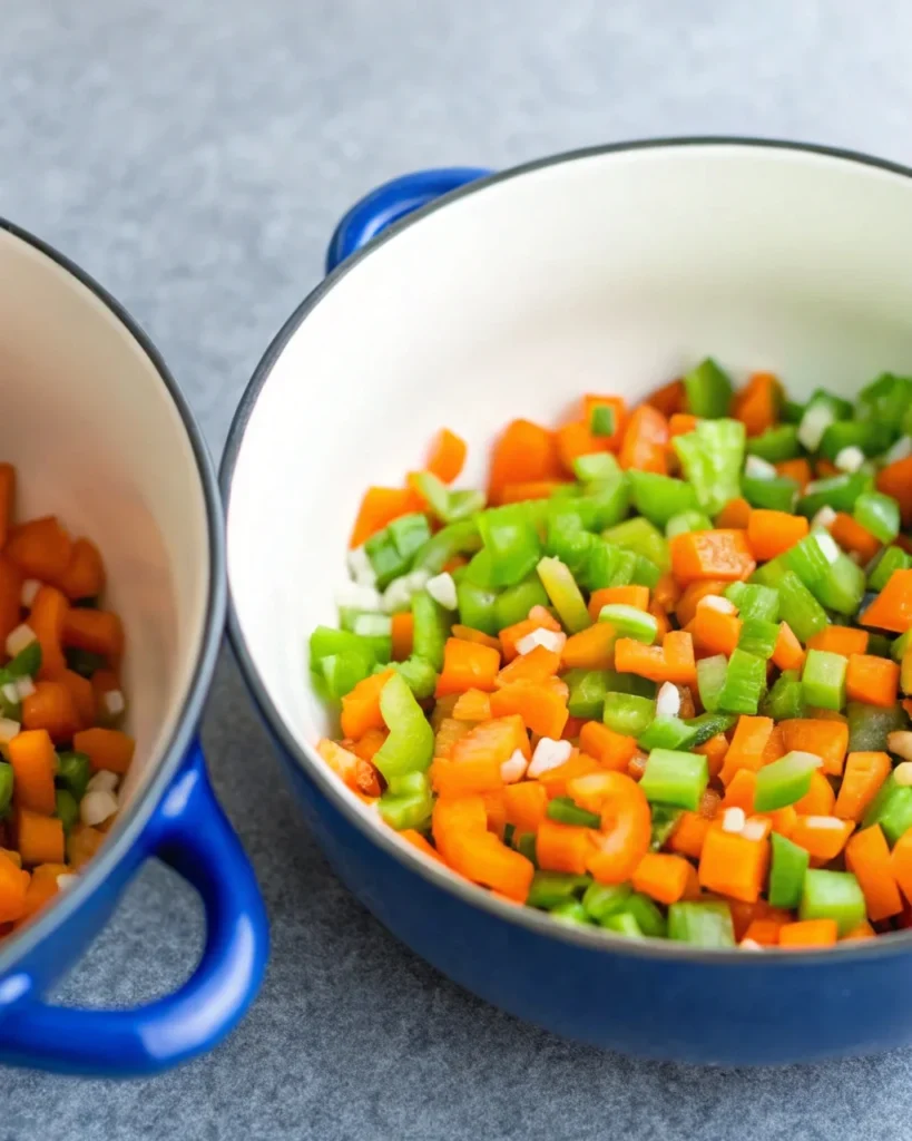 - Add 1 diced yellow onion, 1¼ cups of diced carrots, and 2 diced celery ribs. Sauté for 5–7 minutes until softened.