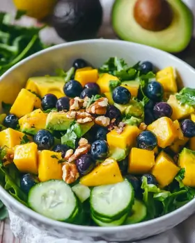 Mango Cucumber Salad with Blueberries and Avocado Recipe. This quick preparation time makes it an excellent choice for a healthy meal or snack. Whether you’re in a rush or just want something light and refreshing, this salad is ready in no time!