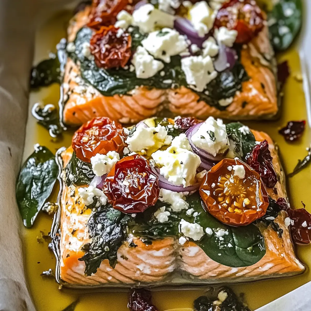 Layer fresh spinach, red onion slices, and chopped sun-dried tomatoes over each salmon fillet. The colorful toppings will not only provide a burst of flavor but also visually enhance the dish. Finally, crumble feta cheese generously over the salmon and finish with a sprinkle of dried oregano for that signature Mediterranean flavor profile.