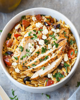 A vibrant, Mediterranean-inspired dish made with juicy seasoned chicken, tender orzo pasta, and crisp fresh vegetables. Finished with feta cheese, lemon, and herbs, it’s a wholesome and delicious meal for any occasion.