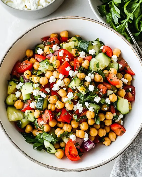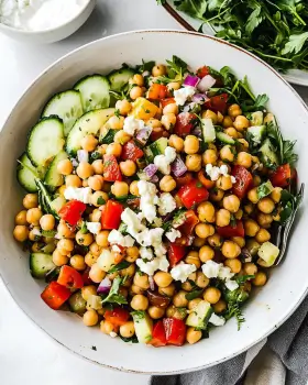 A refreshing Mediterranean Chickpea Salad that combines chickpeas, fresh vegetables, and a tangy dressing for a healthy and delicious meal.