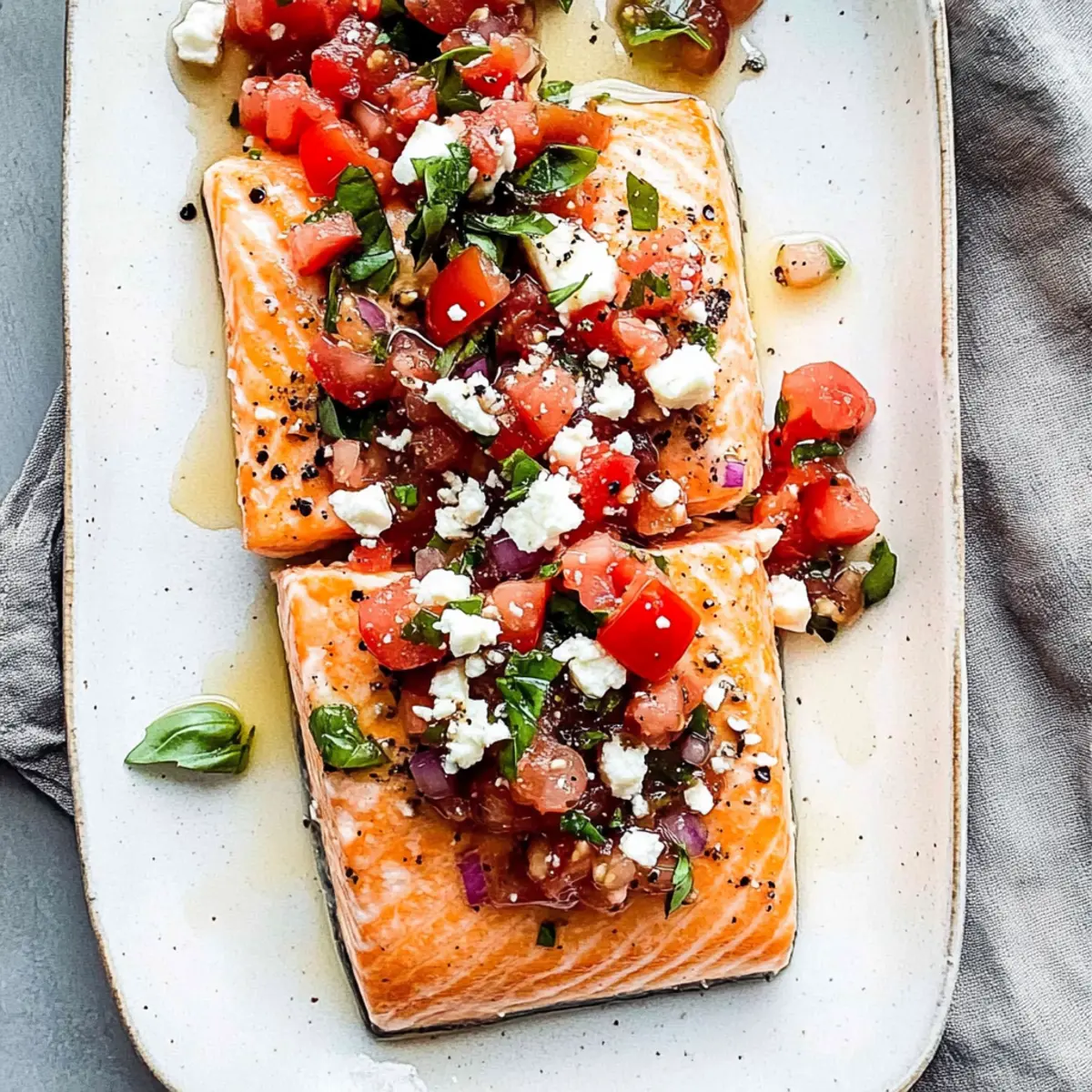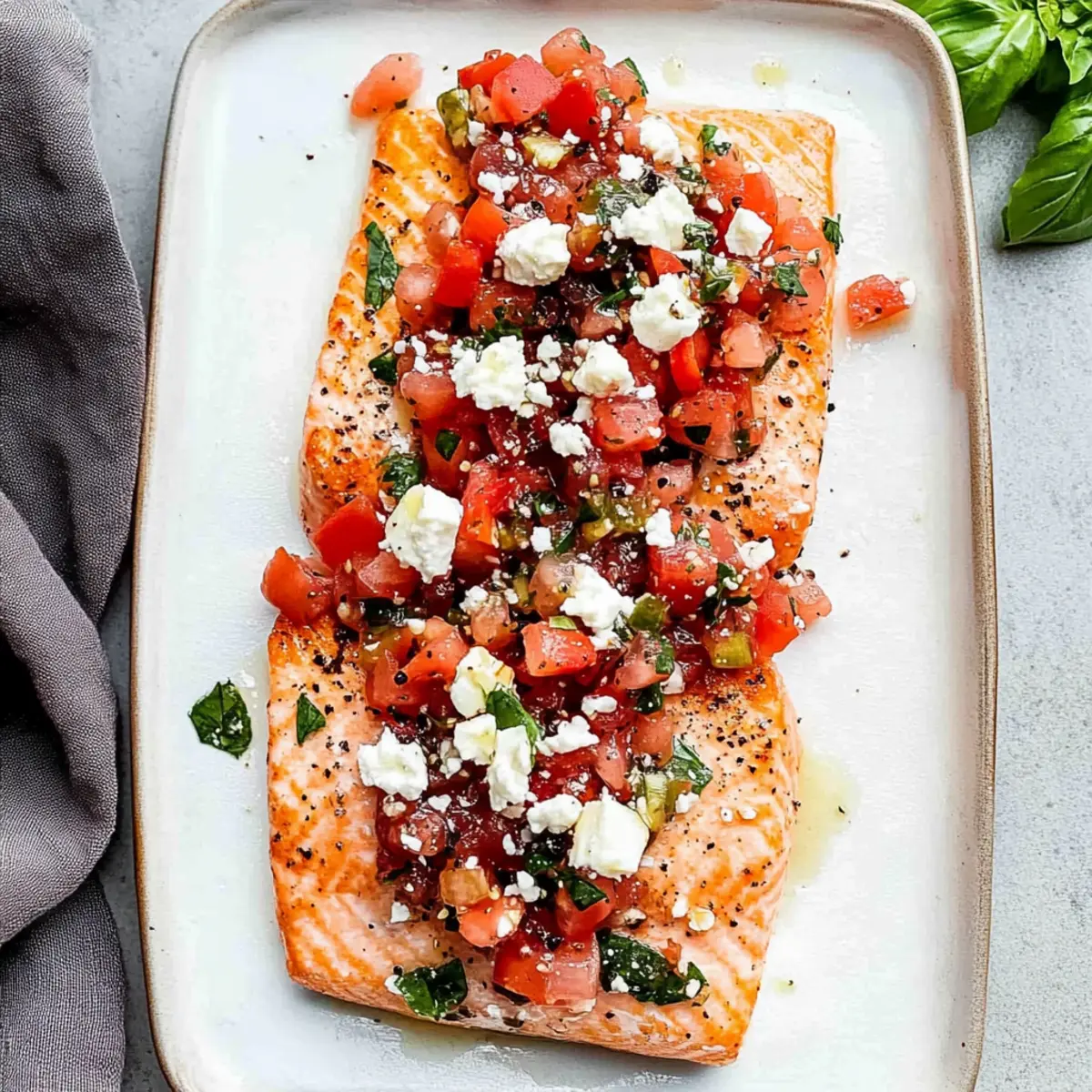 While the salmon is cooking, prepare the vibrant salsa. In a mixing bowl, combine diced Roma tomatoes, sliced Kalamata olives, crumbled feta cheese, and chopped fresh basil. Drizzle in a splash of olive oil and a few teaspoons of balsamic vinegar, then add freshly ground black pepper to taste. Mix everything together until well combined for a refreshing topping.
