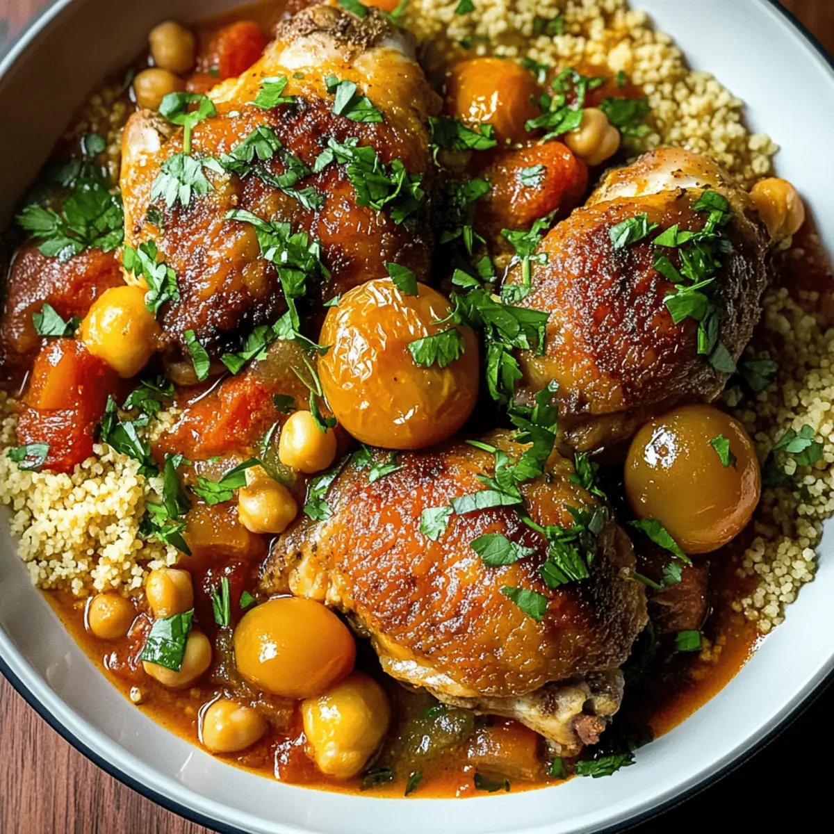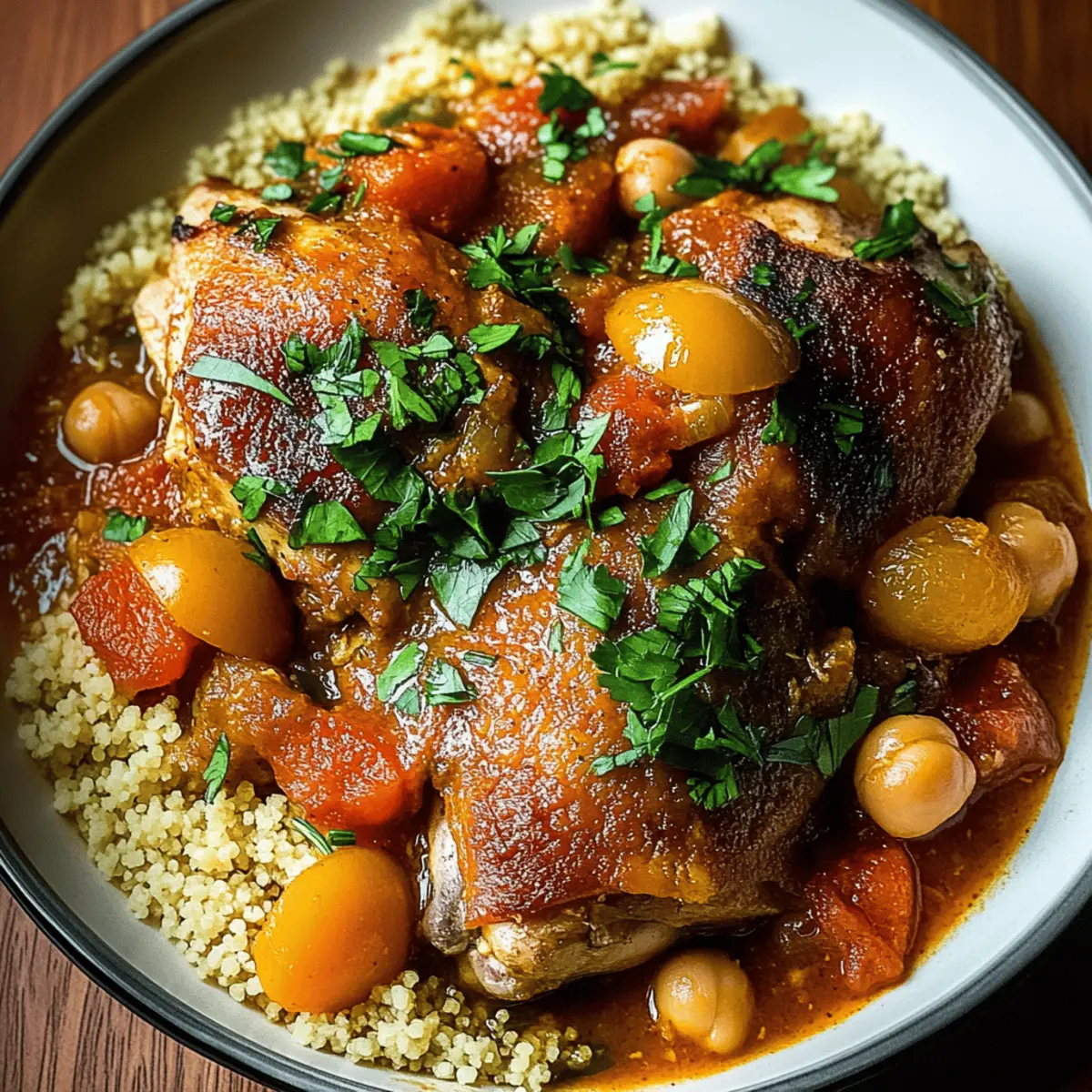 - Scoop the Moroccan Chicken Stew over fluffy couscous or rice on each plate, and garnish with fresh cilantro or parsley.