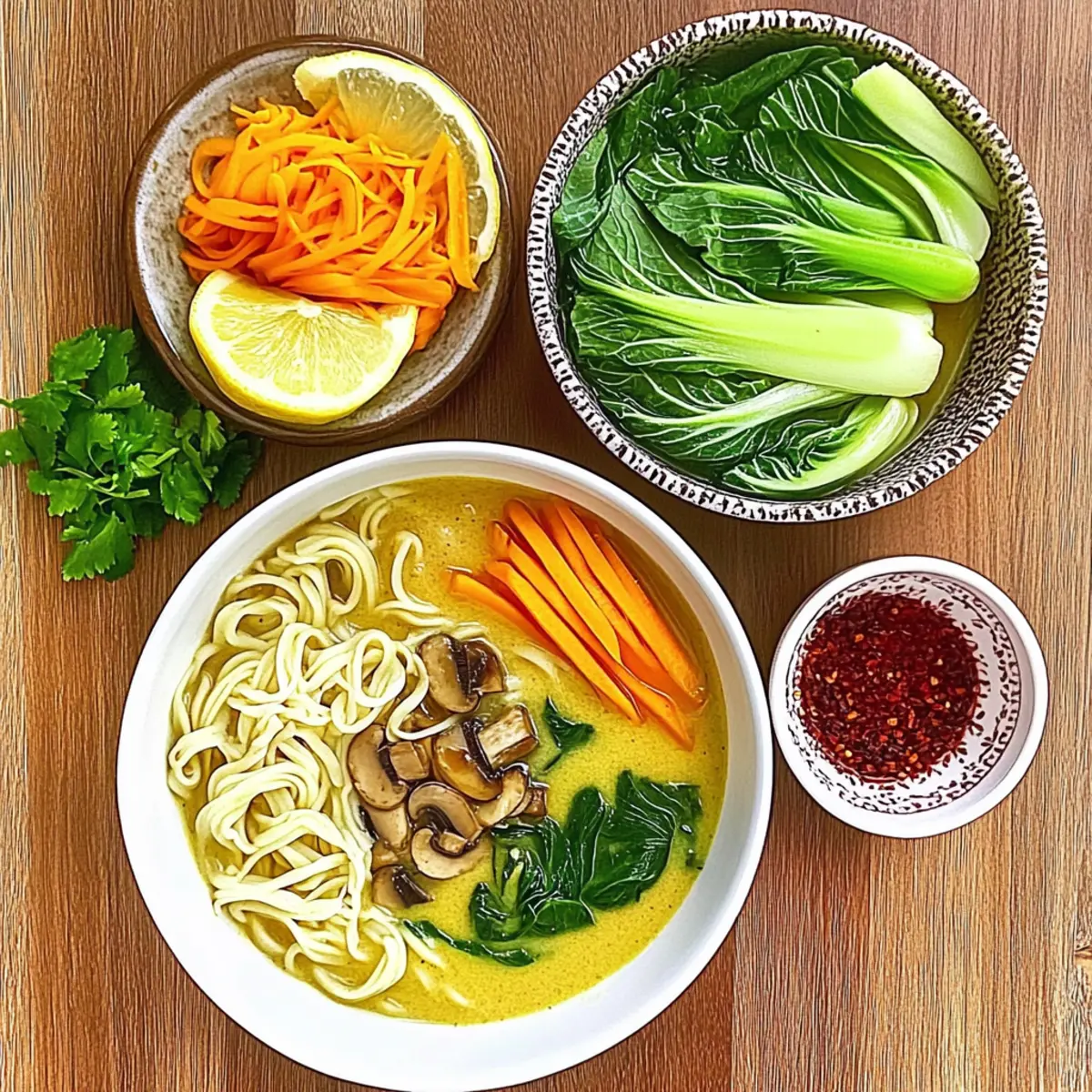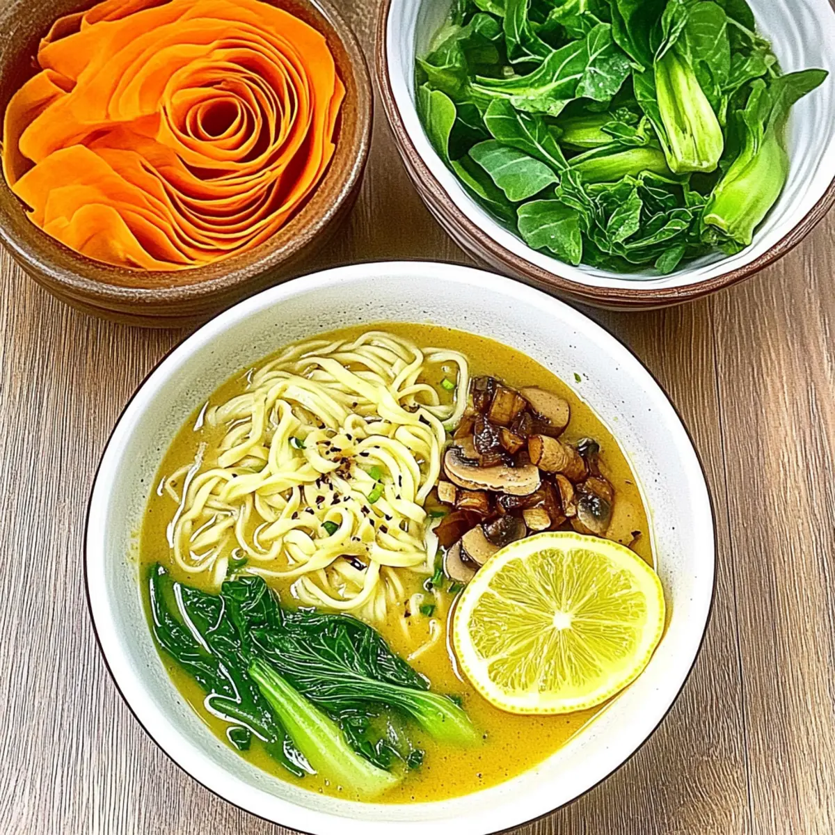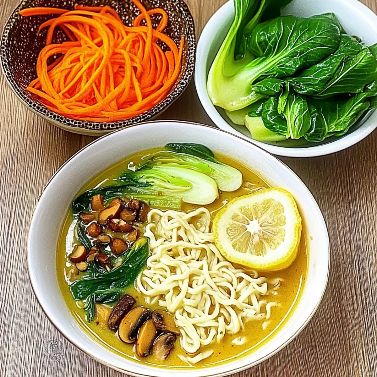 Ladle the warm Peanut Butter Miso Noodle Soup into bowls. Garnish each serving with ribbons of the shredded carrot and a lemon wedge for a fresh, zesty touch. This final step enhances both the presentation and flavor, inviting you to dive into a delightful meal that warms your heart and soul.