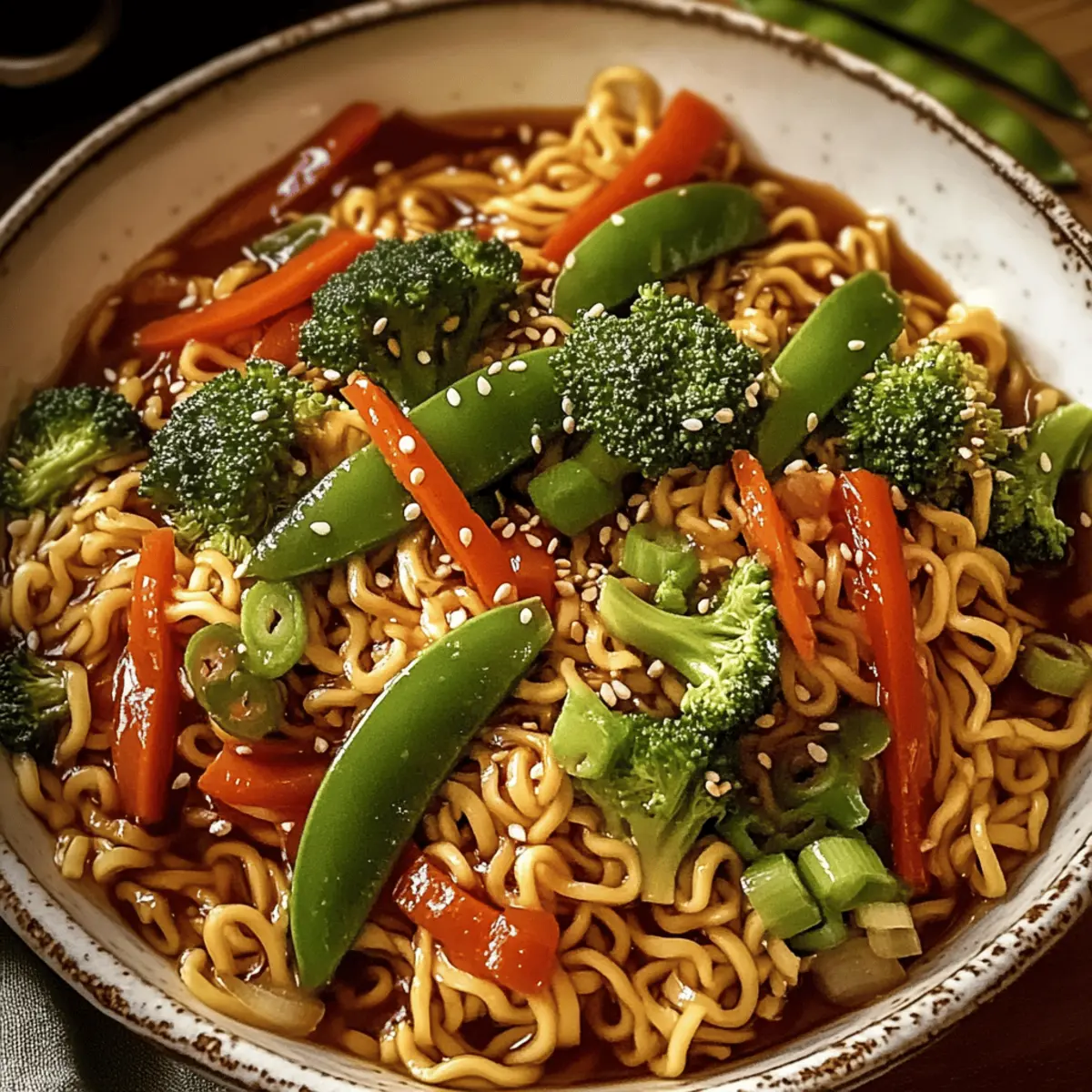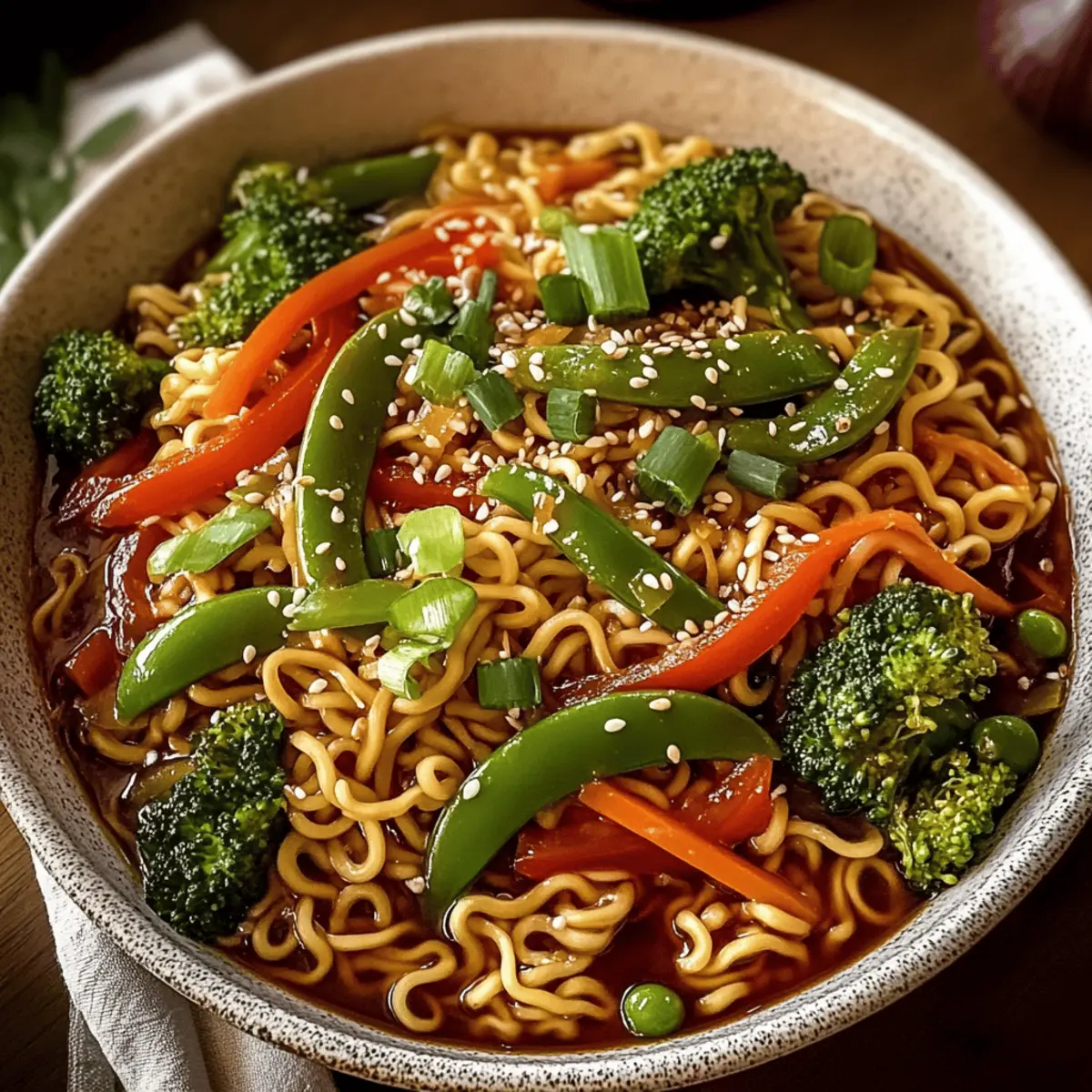 Colorful Crunch: Keep your vegetables crispy by stir-frying them just until tender, preserving both texture and color for your Saucy Ramen Noodles Vegan.
