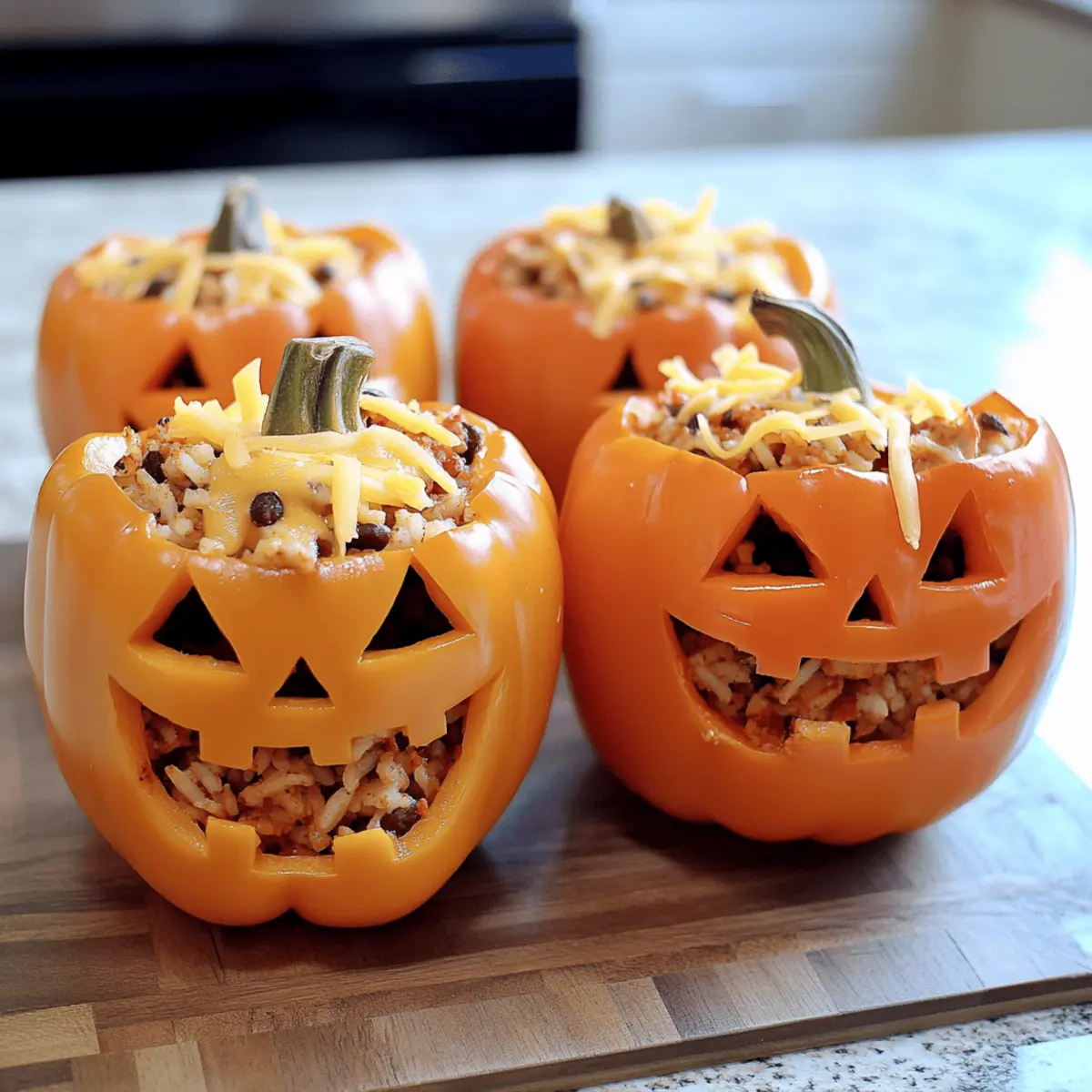 Festive Fun: These Halloween Stuffed Peppers not only bring a playful twist to your dinner table but also let your creativity shine through with fun carving designs.