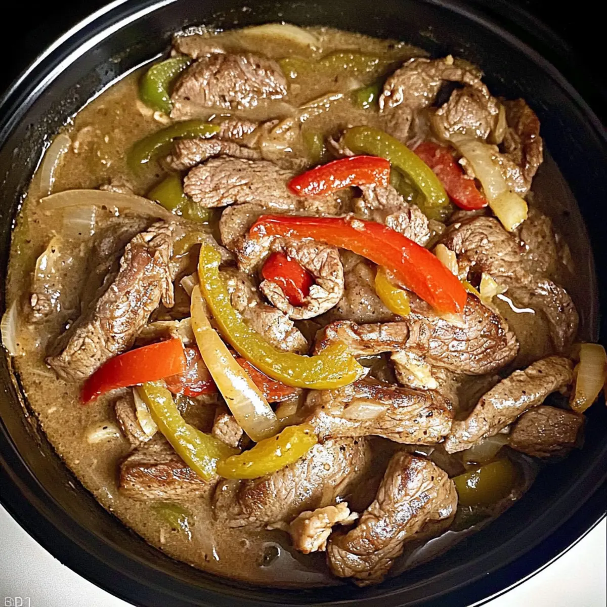 - In a generously sized slow cooker, layer the sliced beef sirloin evenly at the bottom, followed by the onions, bell peppers, and optional mushrooms.