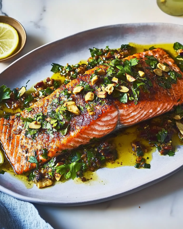 Introduction to Slow-Roasted Salmon with Walnut Olive Vinaigrette