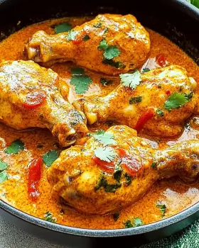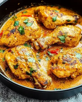 A bold and creamy dish featuring chicken thighs cooked in a rich coconut milk sauce with spices.
