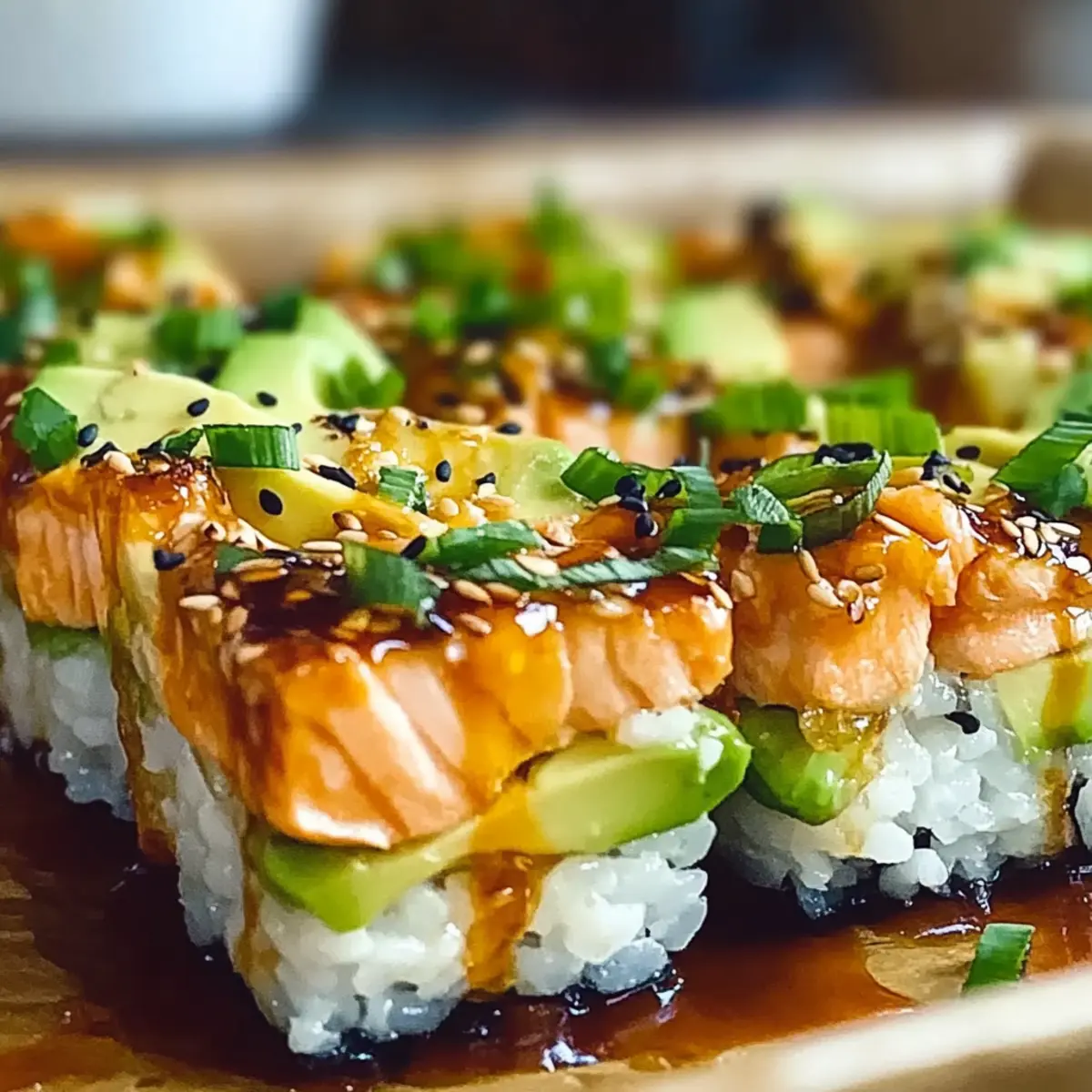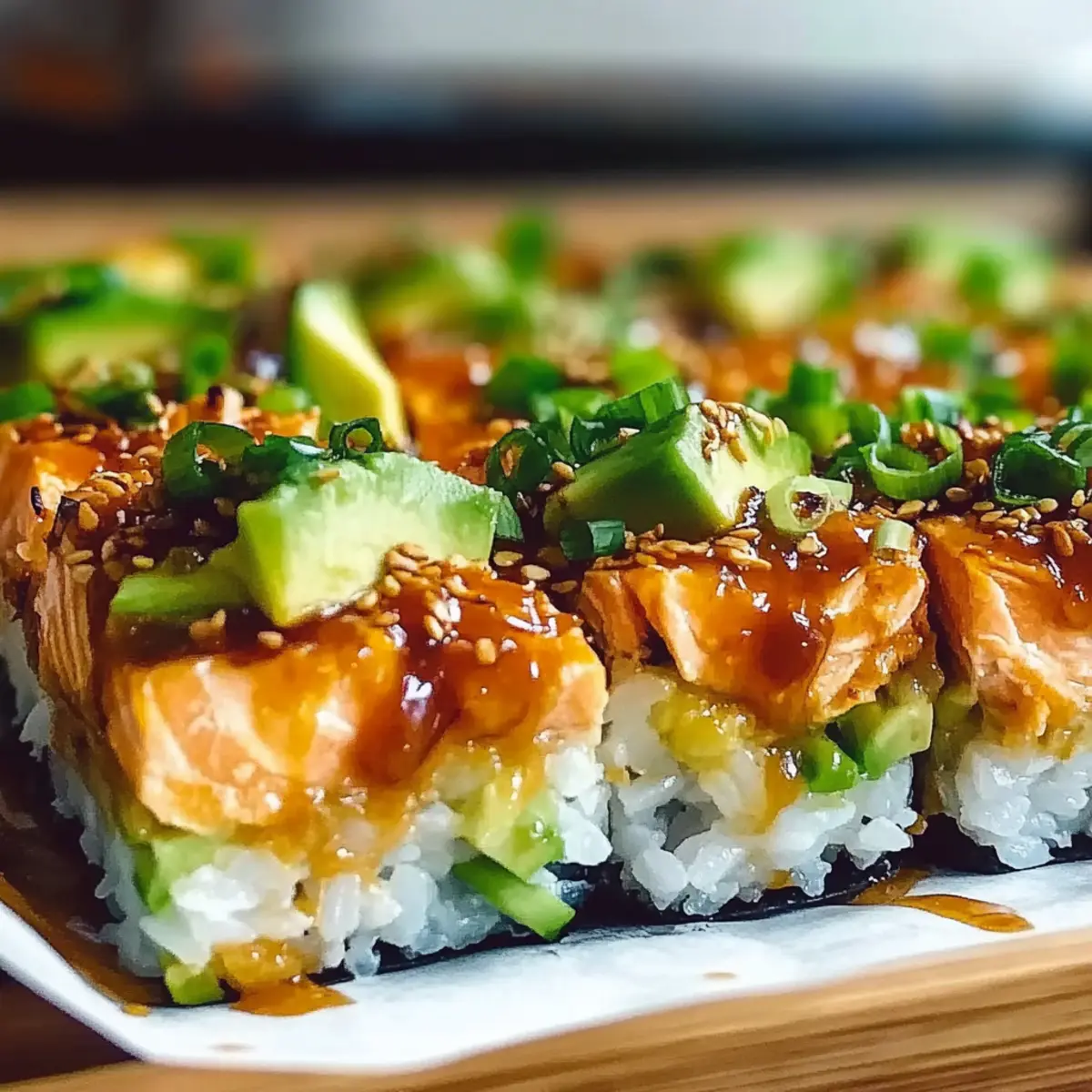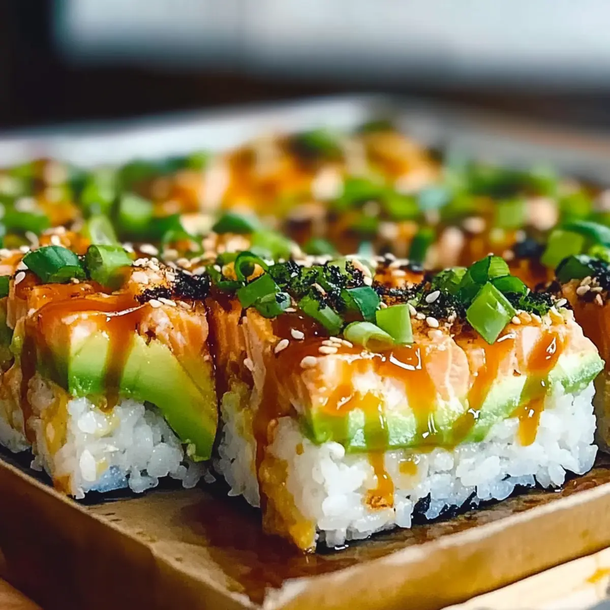 Once baked, carefully remove the Spicy Salmon Sushi Bake from the oven and let it cool for a few minutes. Top with fresh slices of avocado and a sprinkle of chopped green onions for added color and crunch. Serve with nori strips on the side, and maybe some soy sauce, to enhance the sushi experience!